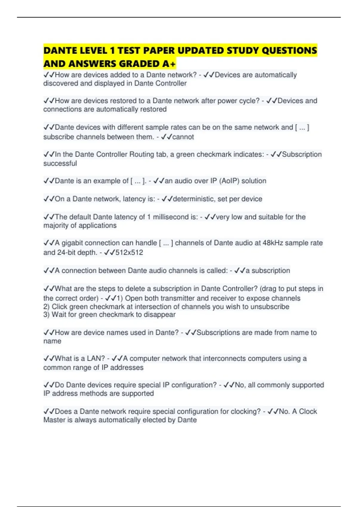 DANTE LEVEL 1 TEST PAPER UPDATED STUDY QUESTIONS AND ANSWERS GRADED A+