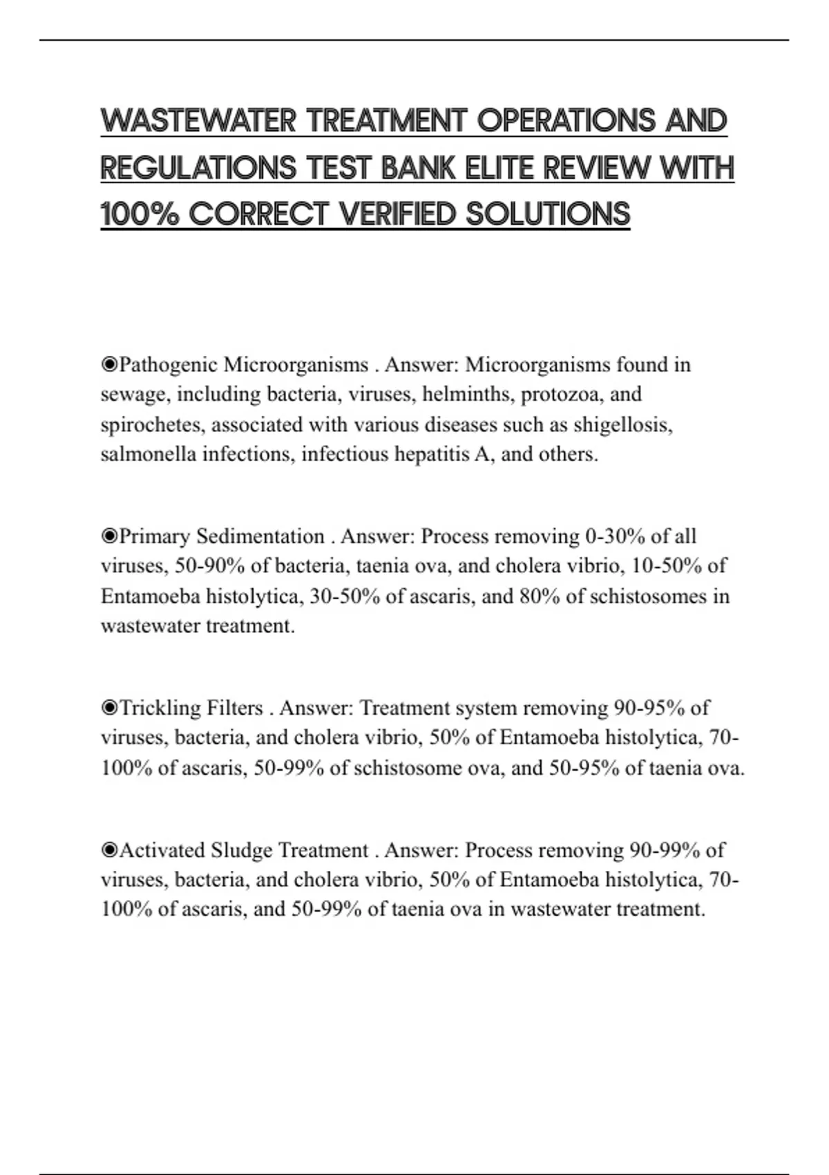 WASTEWATER TREATMENT OPERATIONS AND REGULATIONS TEST BANK ELITE REVIEW WITH 100% CORRECT VERIFIED SOLUTIONS