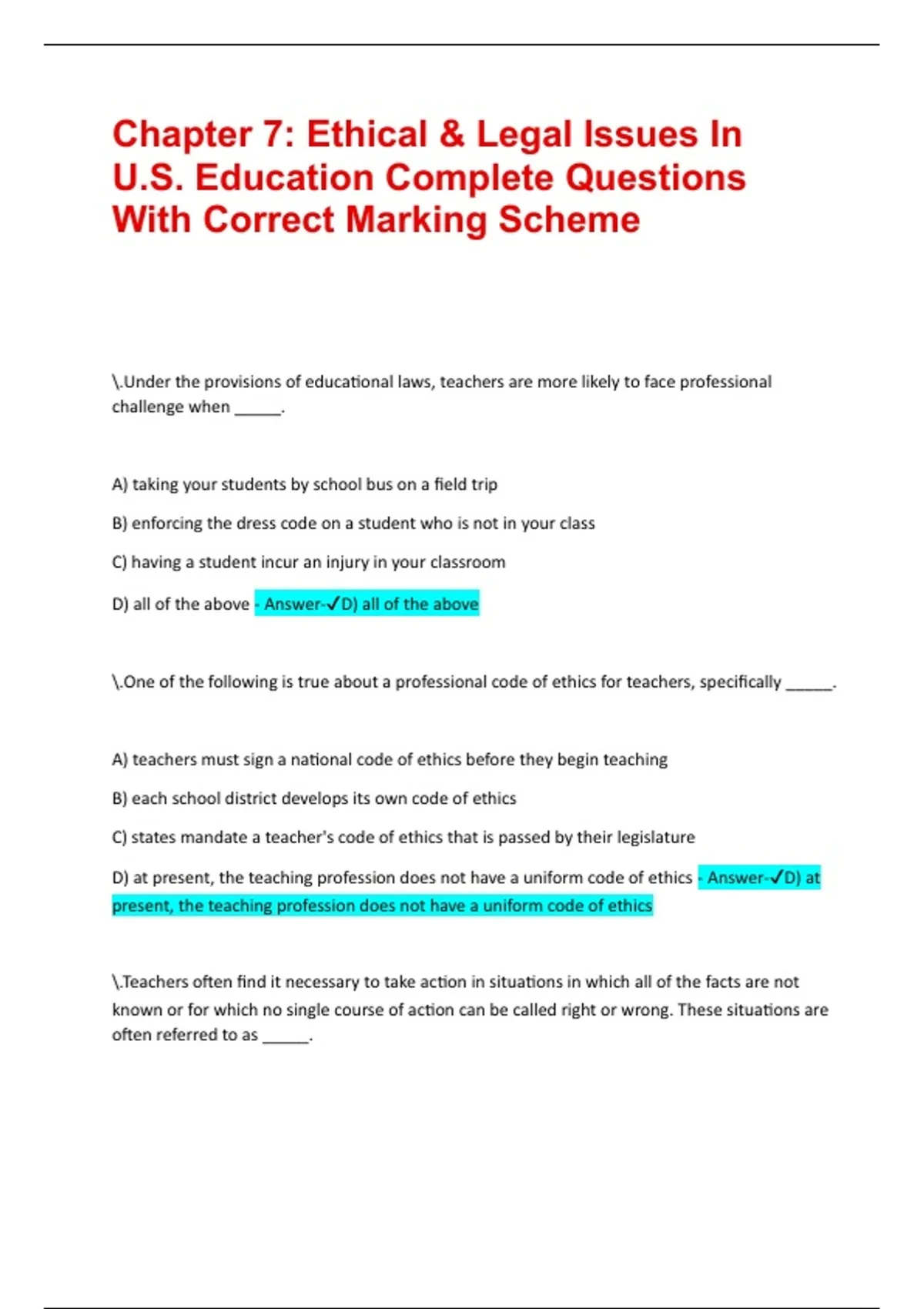 Chapter 7: Ethical & Legal Issues In U.S. Education Complete Questions With Correct Marking Scheme
