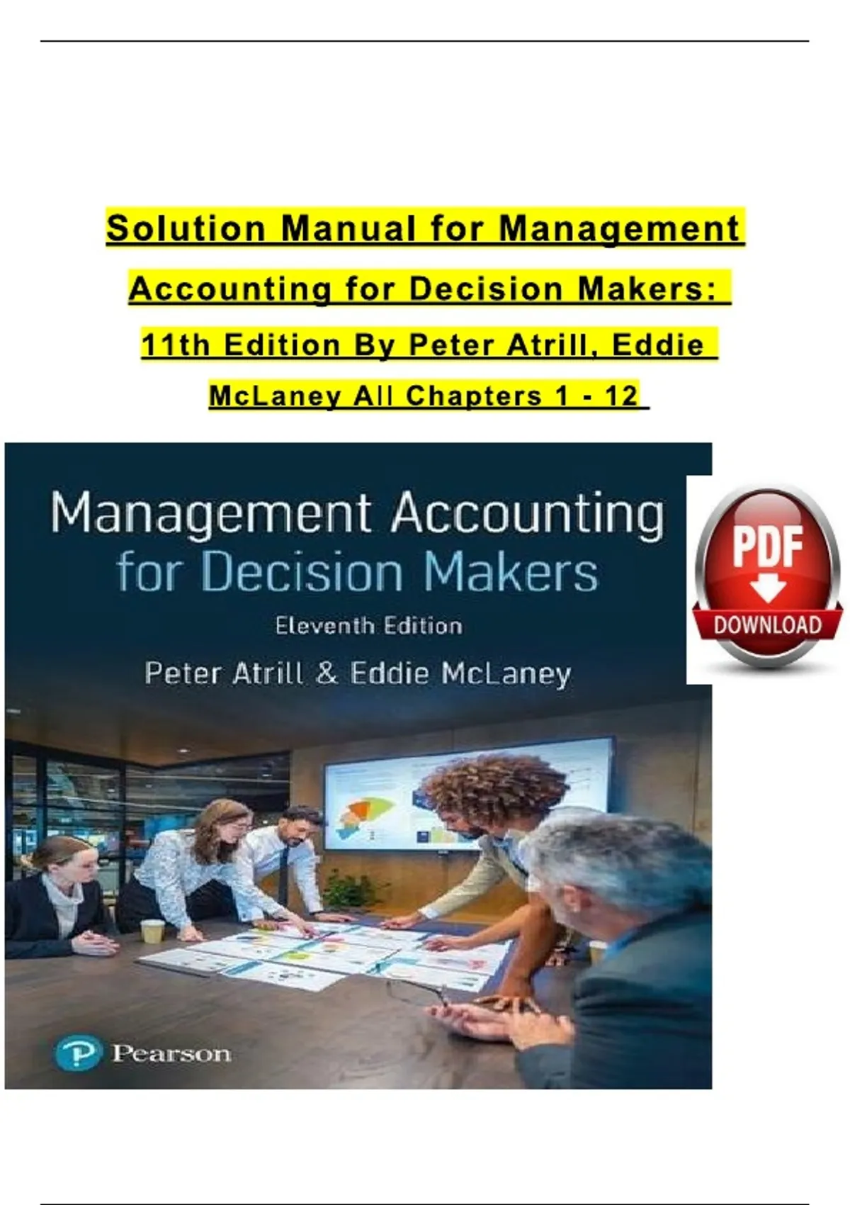 This is the Solution Manual for the 11th Edition of the textbook Management Accounting for Decision Makers by Peter Atrill and Eddie McLaney. It offers complete, detailed solutions for all 12 chapters, serving as an essential resource for students and educators. The manual covers core concepts in management accounting, including relevant costs and benefits for decision making, cost-volume-profit analysis, full costing, budgeting, accounting for control, and making capital investment decisions. It also addresses strategic management accounting and performance evaluation in competitive environments.