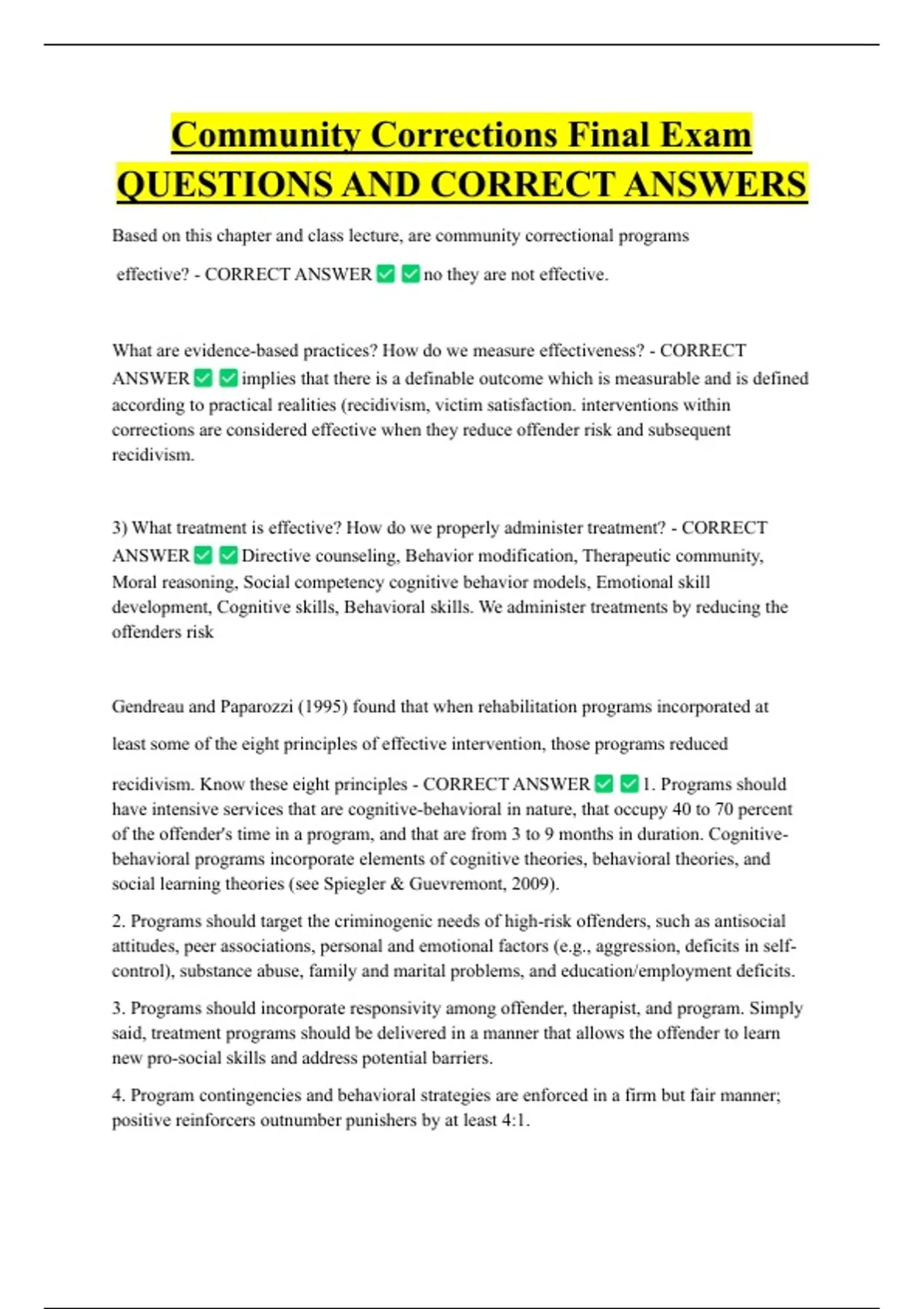 Community Corrections Final Exam QUESTIONS AND CORRECT ANSWERS Based on this chapter and class lecture, are community correctional programs effective? - CORRECT ANSWER no they are not effective. What are evidence-based practices? How do we measure effectiveness? - CORRECT ANSWER implies that there is a definable outcome which is measurable and is defined according to practical realities (recidivism, victim satisfaction. interventions within corrections are considered effective when they reduce offender risk and subsequent recidivism. 3) What treatment is effective? How do we properly administer treatment? - CORRECT ANSWER Directive counseling, Behavior modification, Therapeutic community, Moral reasoning, Social competency cognitive behavior models, Emotional skill development, Cognitive skills, Behavioral skills. We administer treatments by reducing the offenders risk