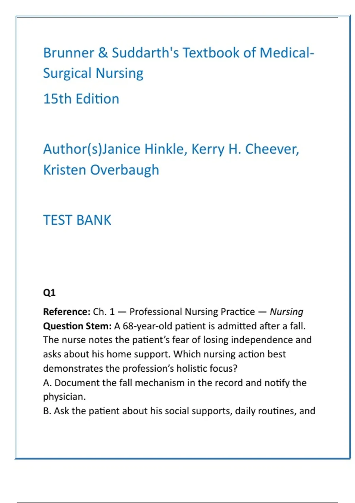 Brunner & Suddarth’s Medical-Surgical Nursing Test Bank (15th Edition) — 2025 NCLEX-RN & HESI Prep | Full Chapter Q&A + Rationales Description: Master your NCLEX-RN, HESI, and ATI exams with the Brunner & Suddarth’s Textbook of Medical-Surgical Nursing (15th Edition) Full Test Bank — the ultimate digital resource for serious nursing students and educators. Built from the world’s leading medical-surgical nursing text, this comprehensive test bank covers every chapter with 20 NCLEX/HESI-style questions each, complete with correct answers, detailed rationales, and clinical reasoning explanations aligned to the 2025 NCLEX-RN Test Plan. Gain the confidence and critical-thinking precision you need to excel in both classroom exams and real-world nursing practice. Every question integrates the nursing process (Assessment → Diagnosis → Planning → Implementation → Evaluation) and focuses on safe, evidence-based decision-making — exactly what NCLEX examiners expect. Features: Full coverage of all chapters in Brunner & Suddarth’s Textbook of Medical-Surgical Nursing (15th Ed.) 20 NCLEX/HESI-style questions per chapter — over 2,000 total items Evidence-based rationales explaining clinical reasoning and pathophysiology Built on the 2025 NCLEX-RN Test Plan and QSEN competencies Reinforces nursing process, prioritization, and patient safety Ideal for NCLEX-RN, HESI, ATI, or course exam prep Trusted by nursing students, educators, and clinical instructors worldwide Save study time, boost test scores, and build clinical mastery using this trusted, exam-ready resource — directly based on Brunner & Suddarth, the gold standard in medical-surgical nursing education. Keywords: medical-surgical nursing test bank Brunner & Suddarth NCLEX questions HESI med-surg prep nursing test bank 15th edition NCLEX-RN medical-surgical review pathophysiology nursing questions evidence-based nursing rationales Brunner and Suddarth test questions Hashtags: #MedicalSurgicalNursing #BrunnerAndSuddarth #NCLEXPrep #HESIExam #NursingStudents #TestBank #NursingEducation #ClinicalReasoning #MedSurgReview #NursingSuccess
