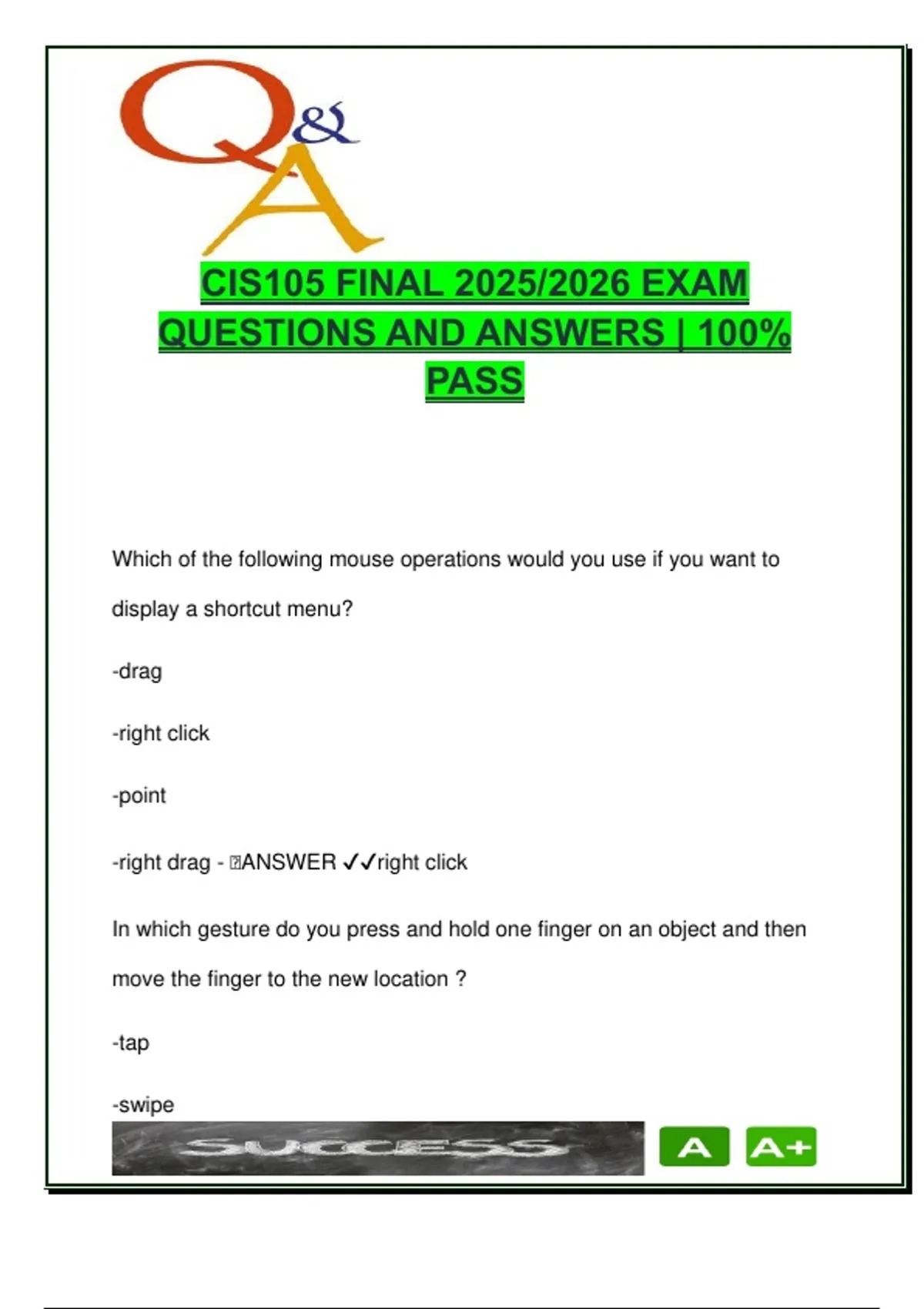 This CIS105 Final Exam 2025/2026 study document includes 85 fully answered and verified multiple-choice and true/false questions designed to help students master key digital literacy and computer concepts. It covers topics essential to information systems and everyday computing tasks, such as mouse operations and touch gestures, file and data management, green computing strategies, internet tools (VoIP, FTP, web portals), email and communication tech, online safety, software types, search engines, spyware, and application use (Word, Excel, image editing, QR codes). The material provides clear, concise answers aligned with real-world computing practices, making it highly suitable for exam prep or quick review. It helps students strengthen practical knowledge related to: Hardware and software interactions Web navigation and browser operations Safe file transfer, storage, and system maintenance Cybersecurity basics and user privacy Basic spreadsheet and document functions Best suited for: Introductory IT or Information Systems students Business students needing computer proficiency Community college or certificate course learners Anyone preparing for CIS105 or general computer literacy finals All questions reflect current technology practices and academic terminology, ensuring learners are up to date with digital expectations across schools and professional environments. Keywords: CIS105 final, mouse gestures, touch screen, internet basics, VoIP, file transfer, system software, application software, defragmenting, file manager, antivirus, spyware, browser plugins, cloud computing, data, information, image editing, QR code, spreadsheet formula, online communication, software categories, email list, cyberbullying, web portal, download, upload, domain name, operating system