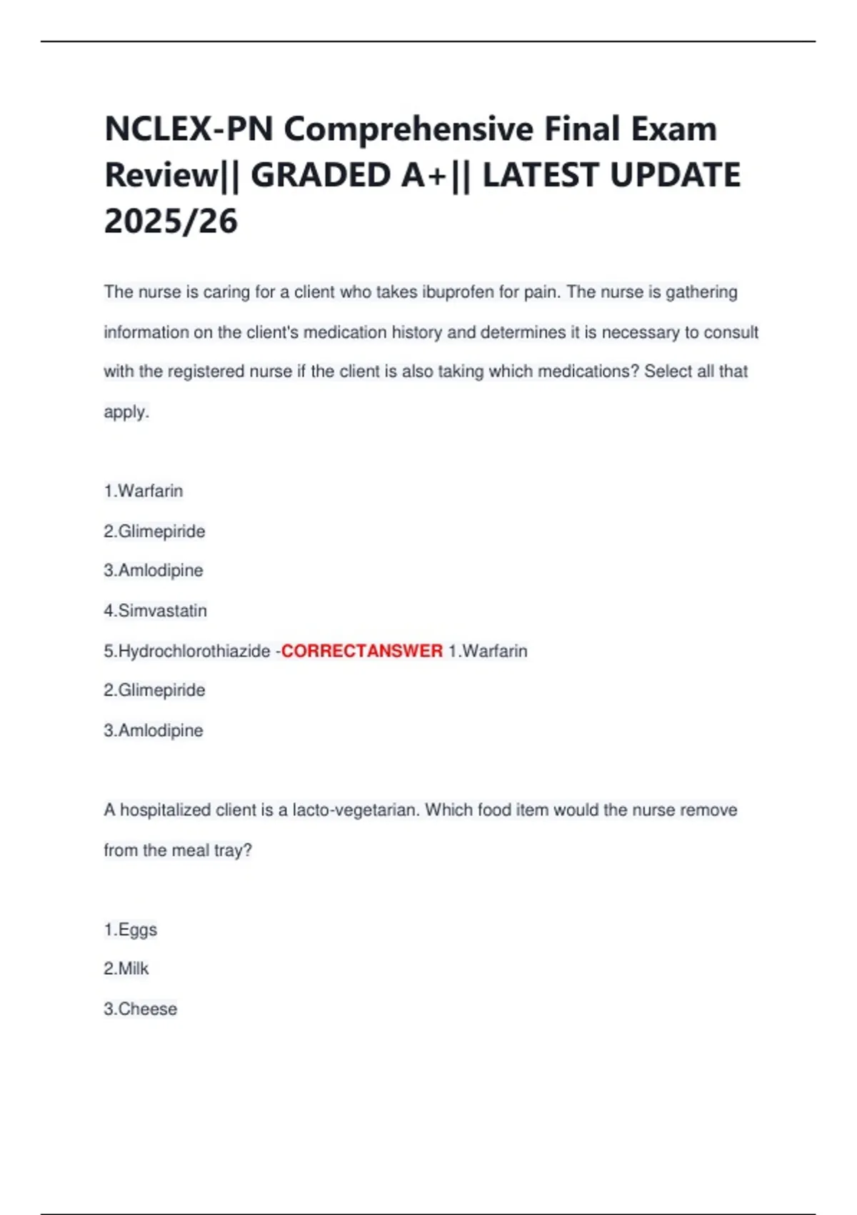 5.Hydrochlorothiazide -CORRECTANSWER 1.Warfarin