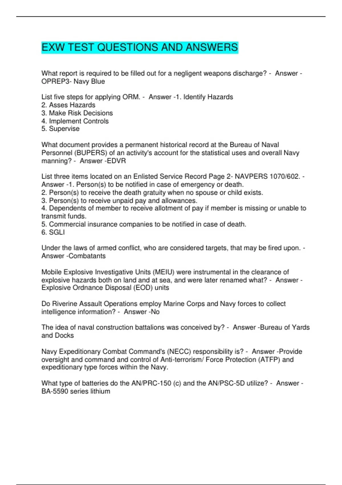 EXW TEST QUESTIONS AND ANSWERS