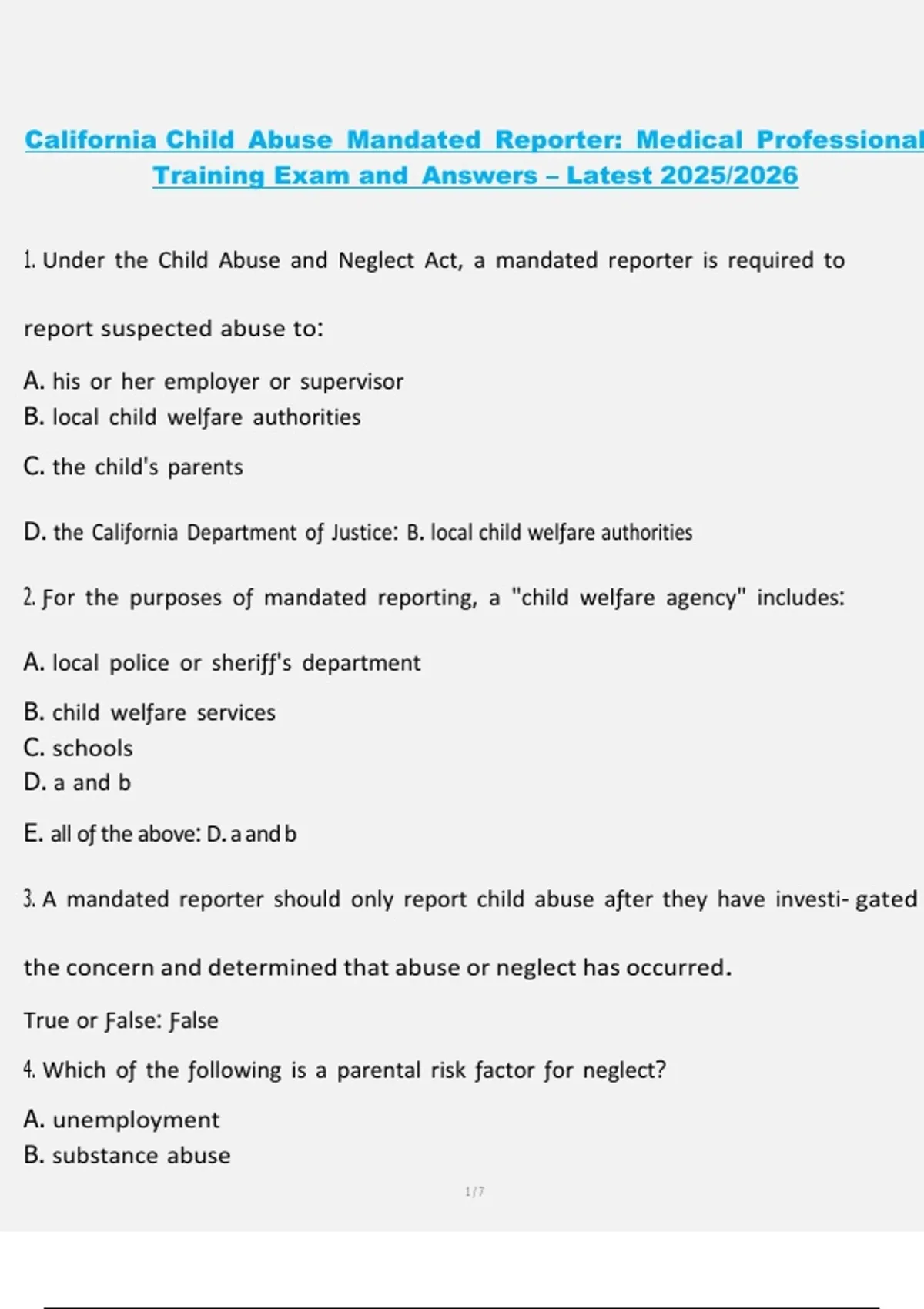 This document provides the latest exam questions and verified answers for the California Child Abuse Mandated Reporter Training designed for medical professionals in 2025/2026. It includes key topics such as recognizing physical and emotional abuse, reporting procedures within healthcare settings, confidentiality requirements, and legal responsibilities for medical staff. Updated according to current California regulations, this resource is ideal for nurses, physicians, and healthcare workers preparing for mandated reporter certification.