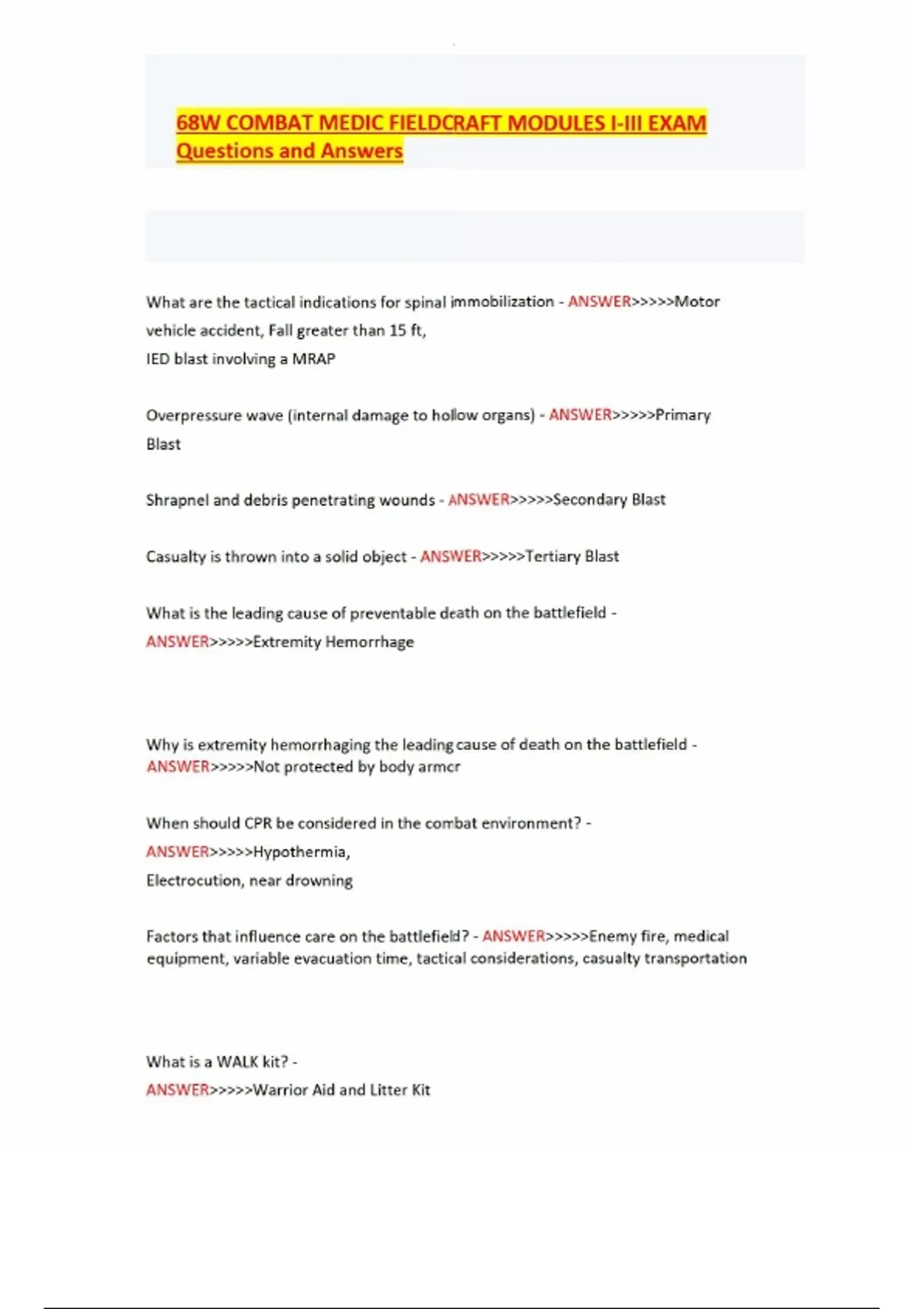 68W COMBAT MEDIC FIELDCRAFT MODULES I-III EXAM Questions and Answers68W COMBAT MEDIC FIELDCRAFT MODULES I-III EXAM Questions and Answers