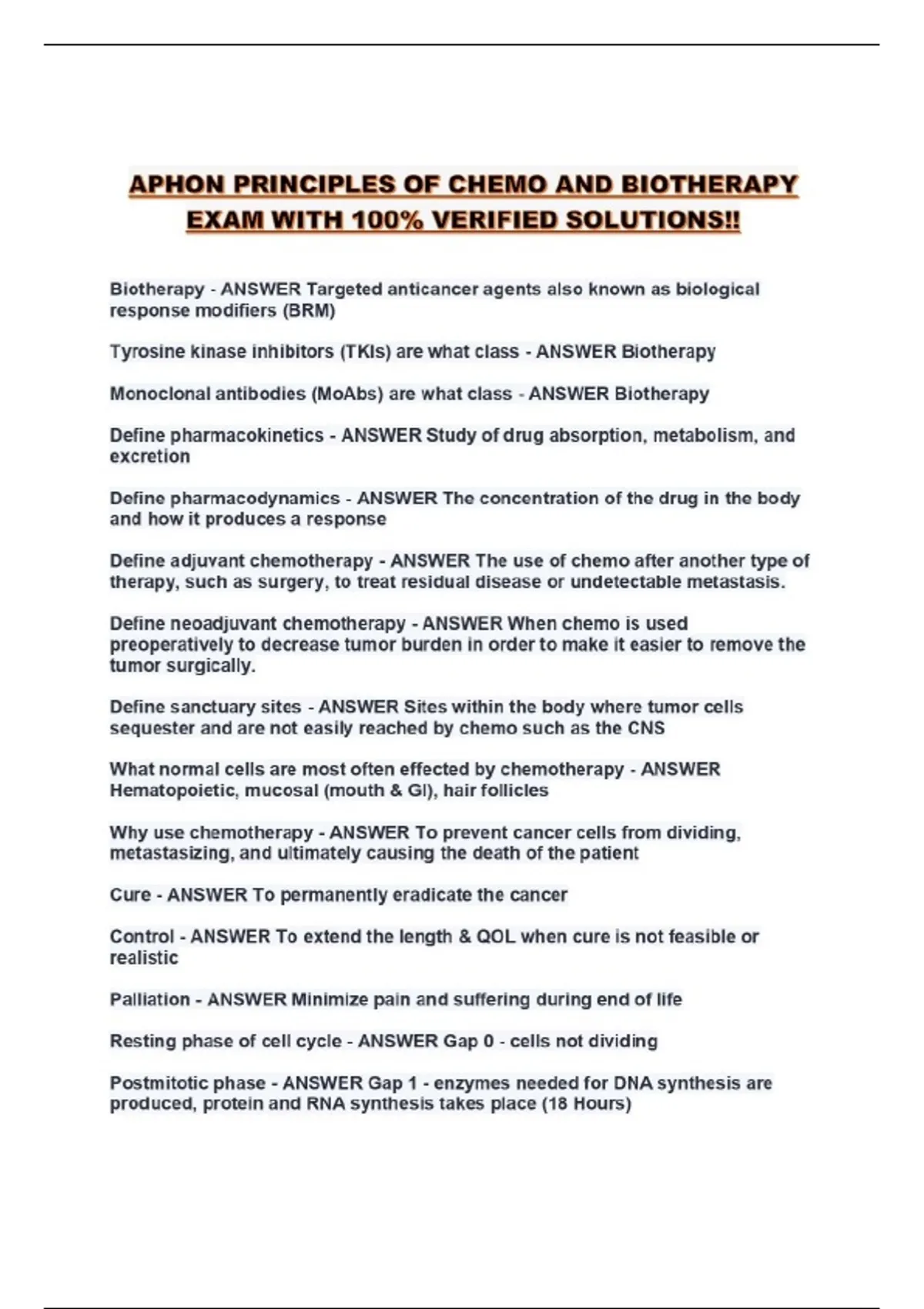 APHON PRINCIPLES OF CHEMO AND BIOTHERAPY EXAM WITH 100% VERIFIED SOLUTIONS!!...