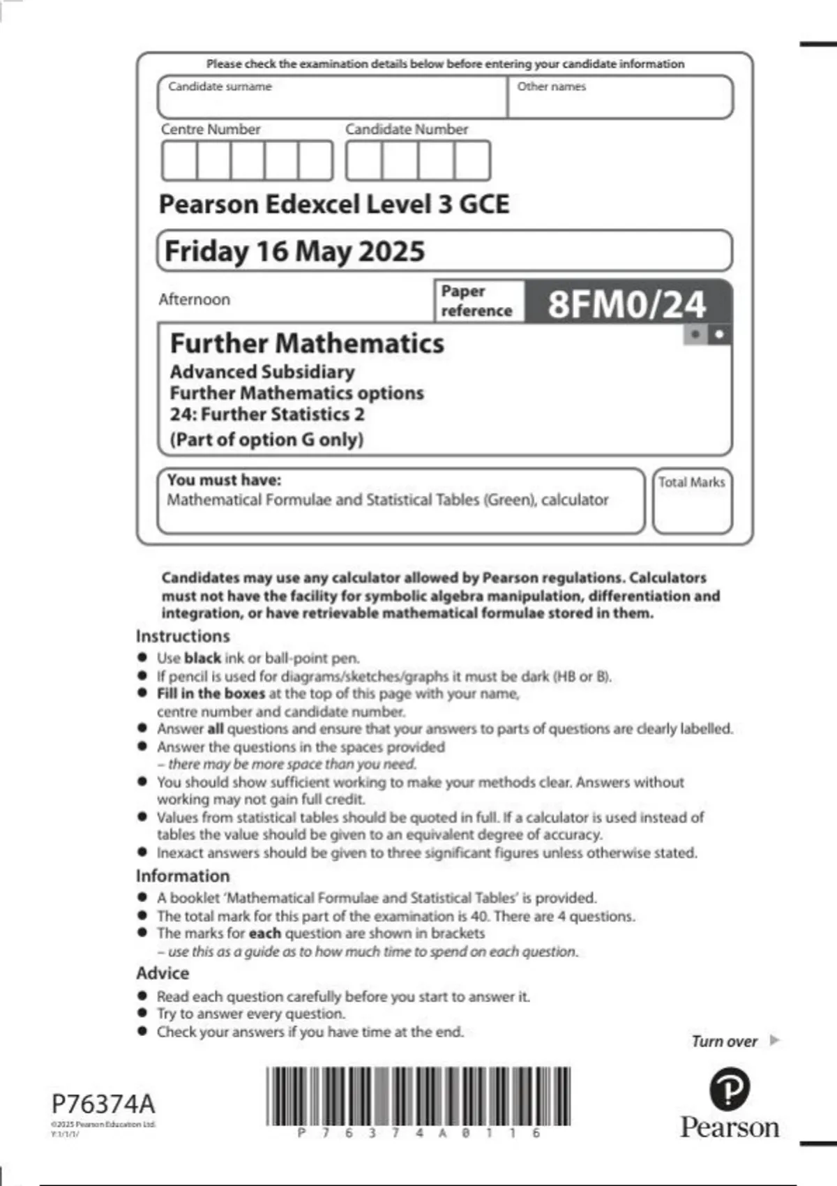 Pearson Edexcel as level Further Mathematics |question paper | 2025| 8FM0/24