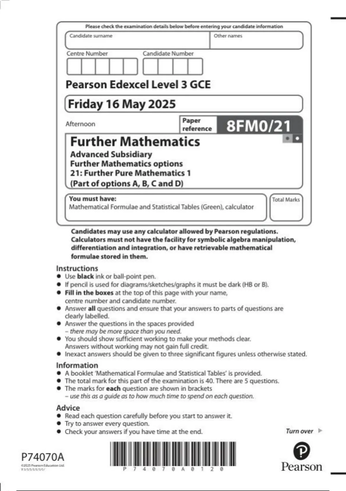 Pearson Edexcel as level Further Mathematics |question paper | 2025| 8FM0/21