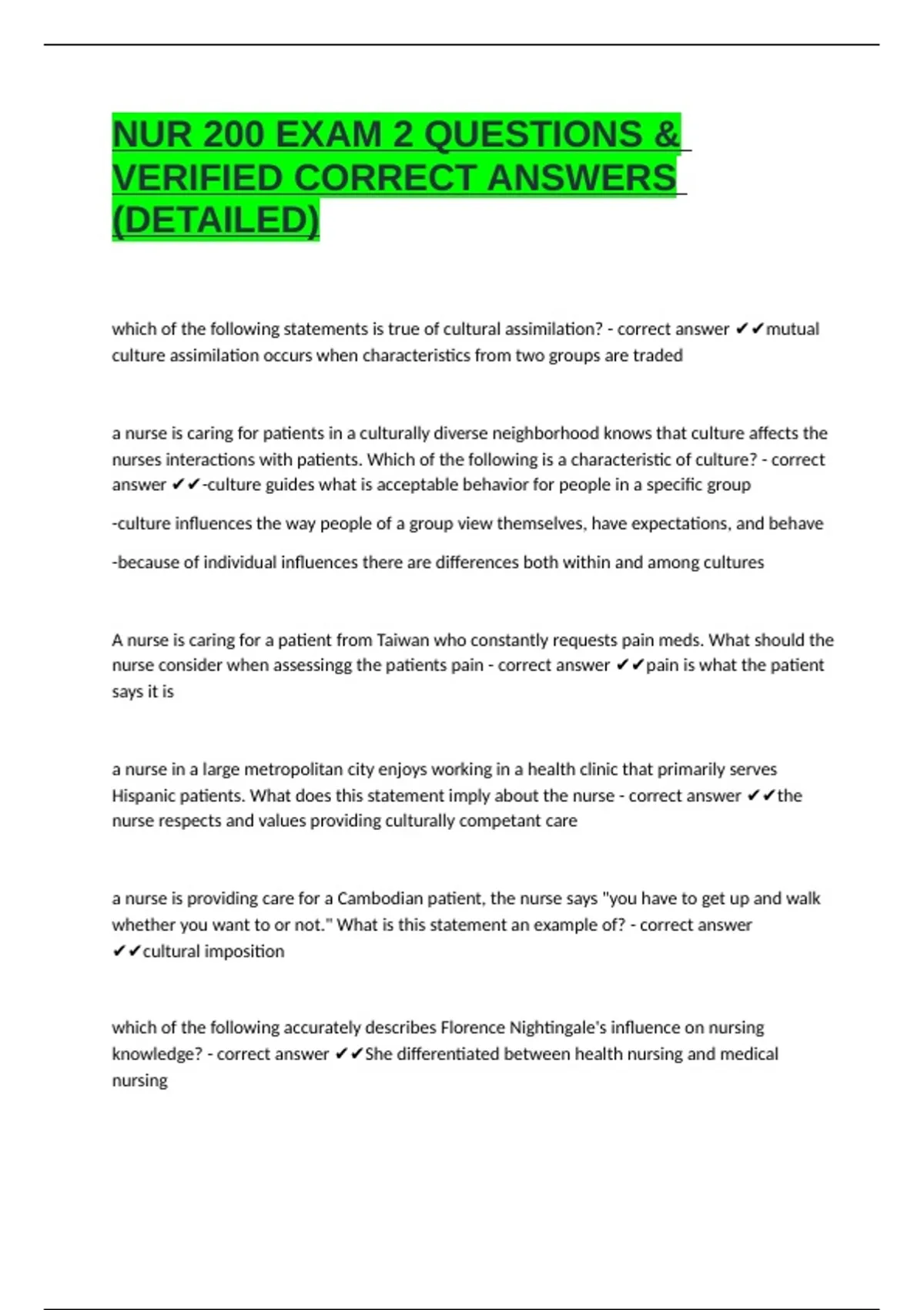 NUR 200 EXAM 2 QUESTIONS & VERIFIED CORRECT ANSWERS (DETAILED)