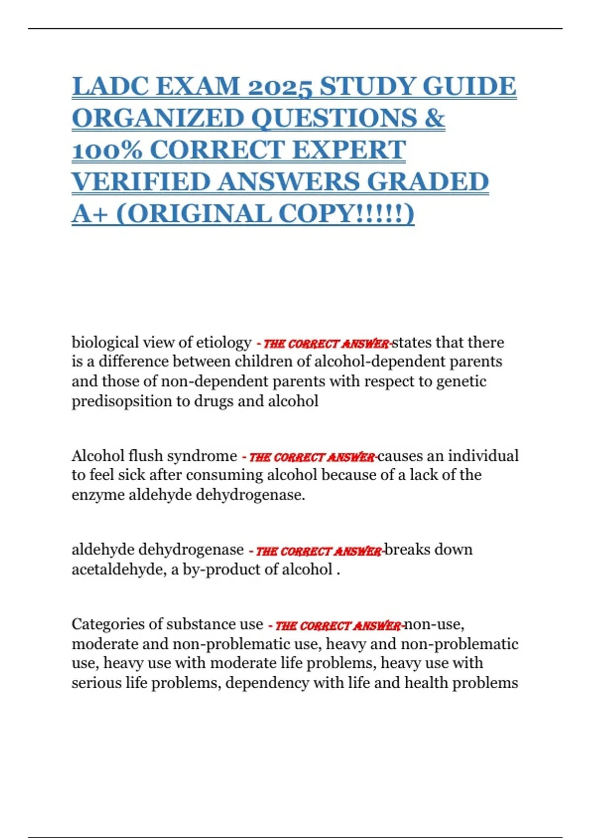 LADC EXAM 2025 STUDY GUIDE ORGANIZED QUESTIONS & 100% CORRECT EXPERT VERIFIED ANSWERS GRADED A+ (ORIGINAL COPY!!!!!)