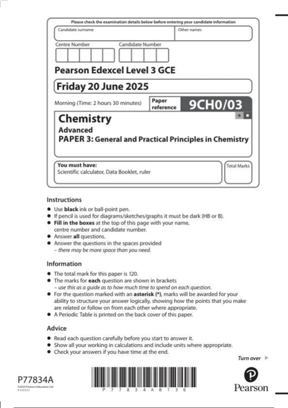 Pearson Edexcel a level Chemistry |question paper | 2025| 9CH0/03