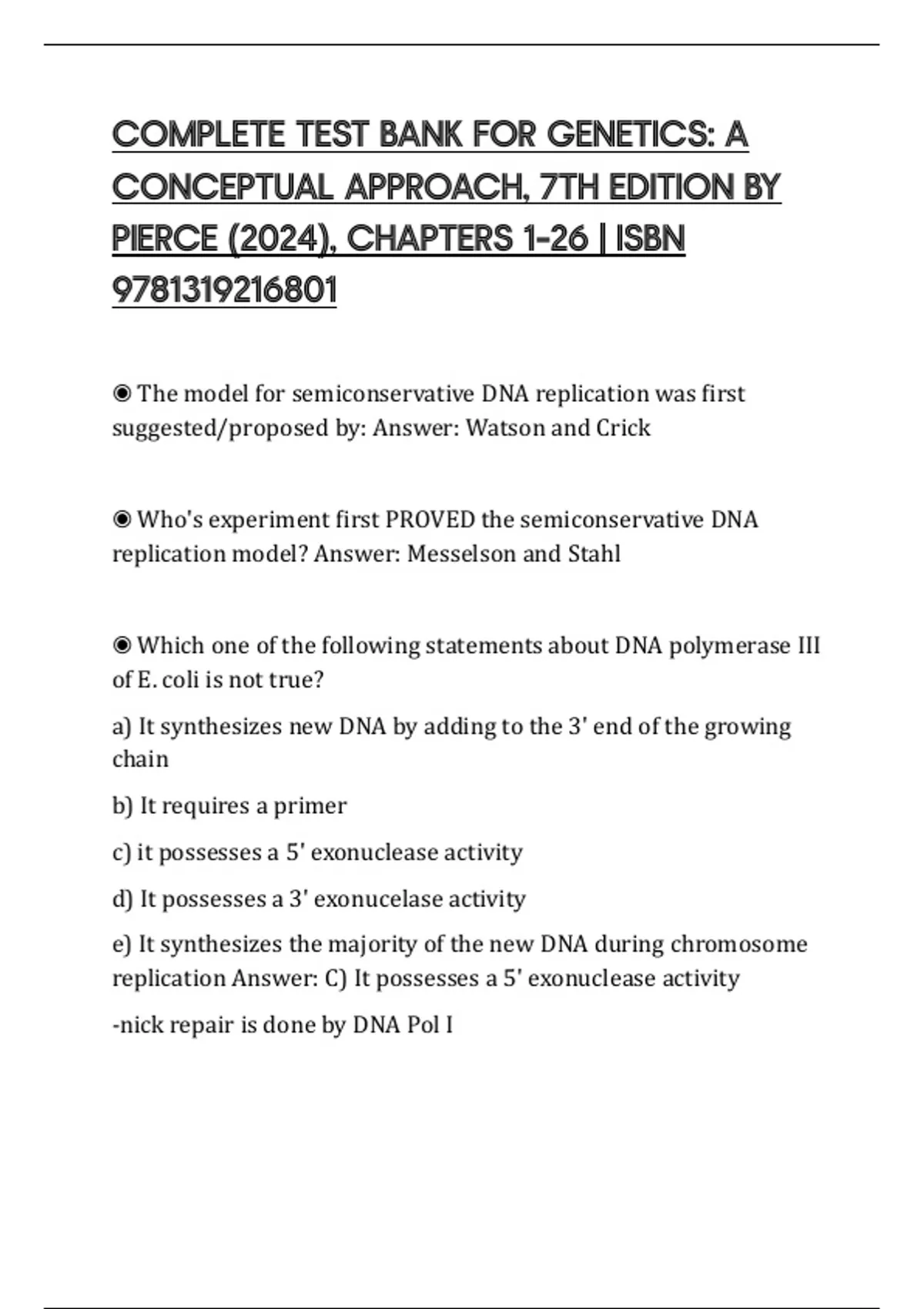 COMPLETE TEST BANK FOR GENETICS: A CONCEPTUAL APPROACH, 7TH EDITION BY PIERCE (2024), CHAPTERS 1–26 | ISBN 9781319216801