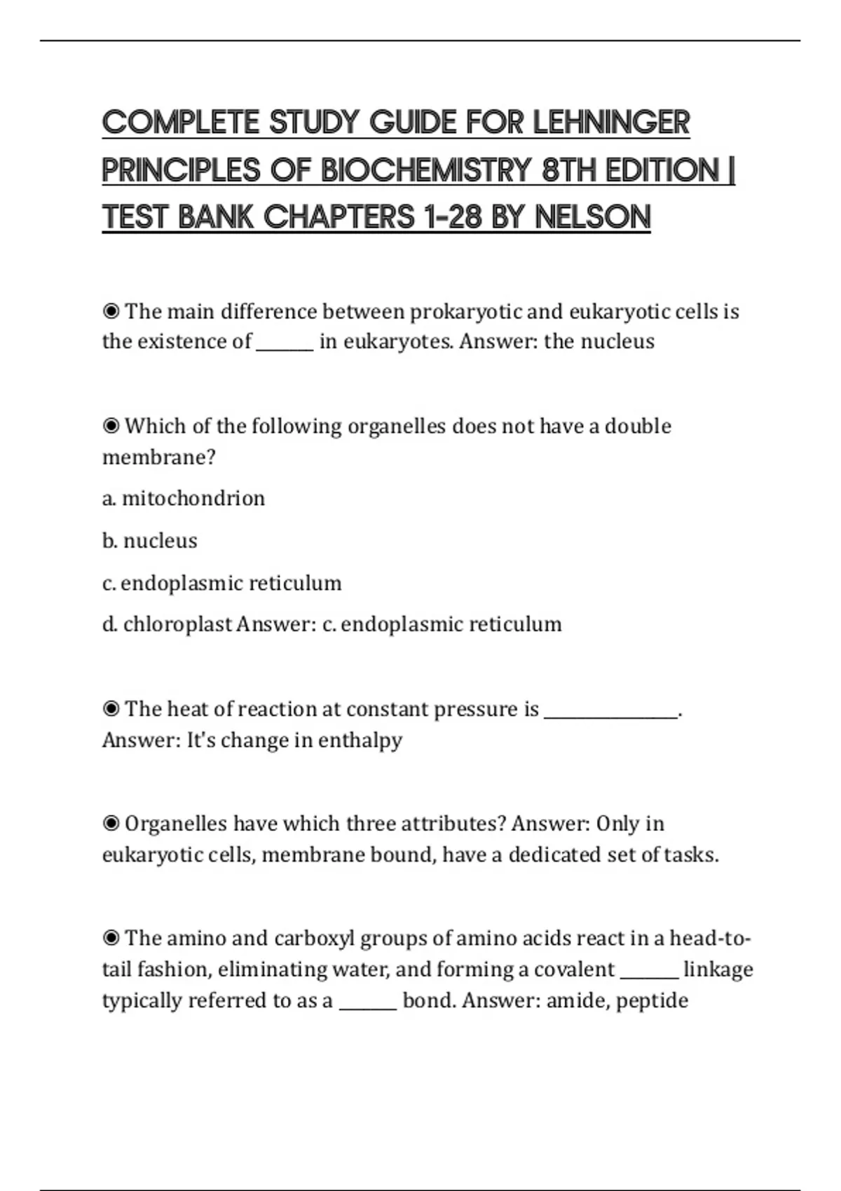 COMPLETE STUDY GUIDE FOR LEHNINGER PRINCIPLES OF BIOCHEMISTRY 8TH EDITION | TEST BANK CHAPTERS 1–28 BY NELSON