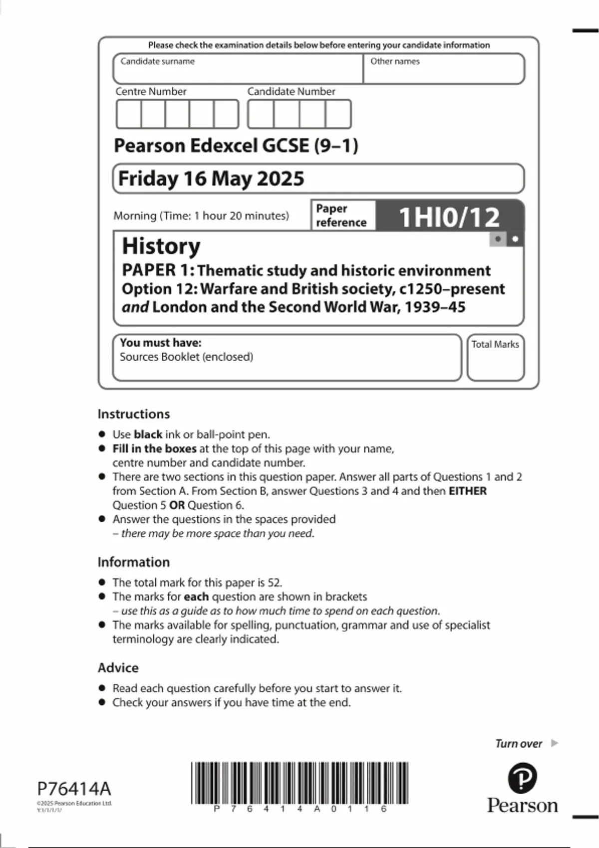 2025 PEARSON EDEXCEL GCSE HISTORY PAPER 1 QUESTION PAPER (1HI0/12: Thematic study and historic environment Option 12: Warfare and British society, c1250–present and London and the Second World War, 1939–45)