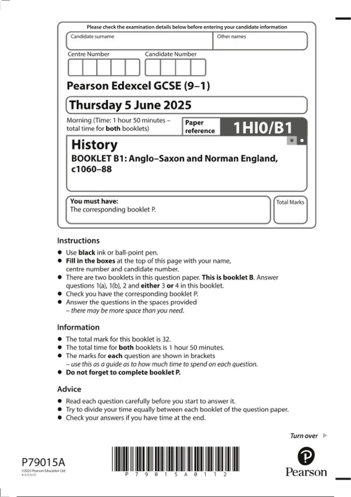 2025 PEARSON EDEXCEL GCSE HISTORY PAPER B1 QUESTION PAPER (1HI0/B1: BOOKLET B1: Anglo–Saxon and Norman England, c1060–88)