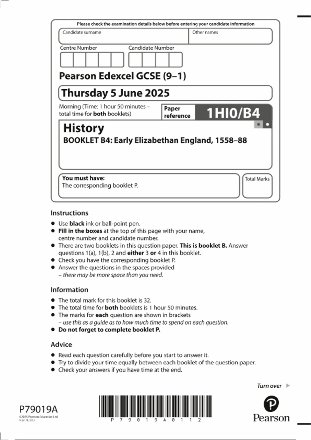 2025 PEARSON EDEXCEL GCSE HISTORY PAPER B4 QUESTION PAPER (1HI0/B4: BOOKLET B4: Early Elizabethan England, 1558–88)