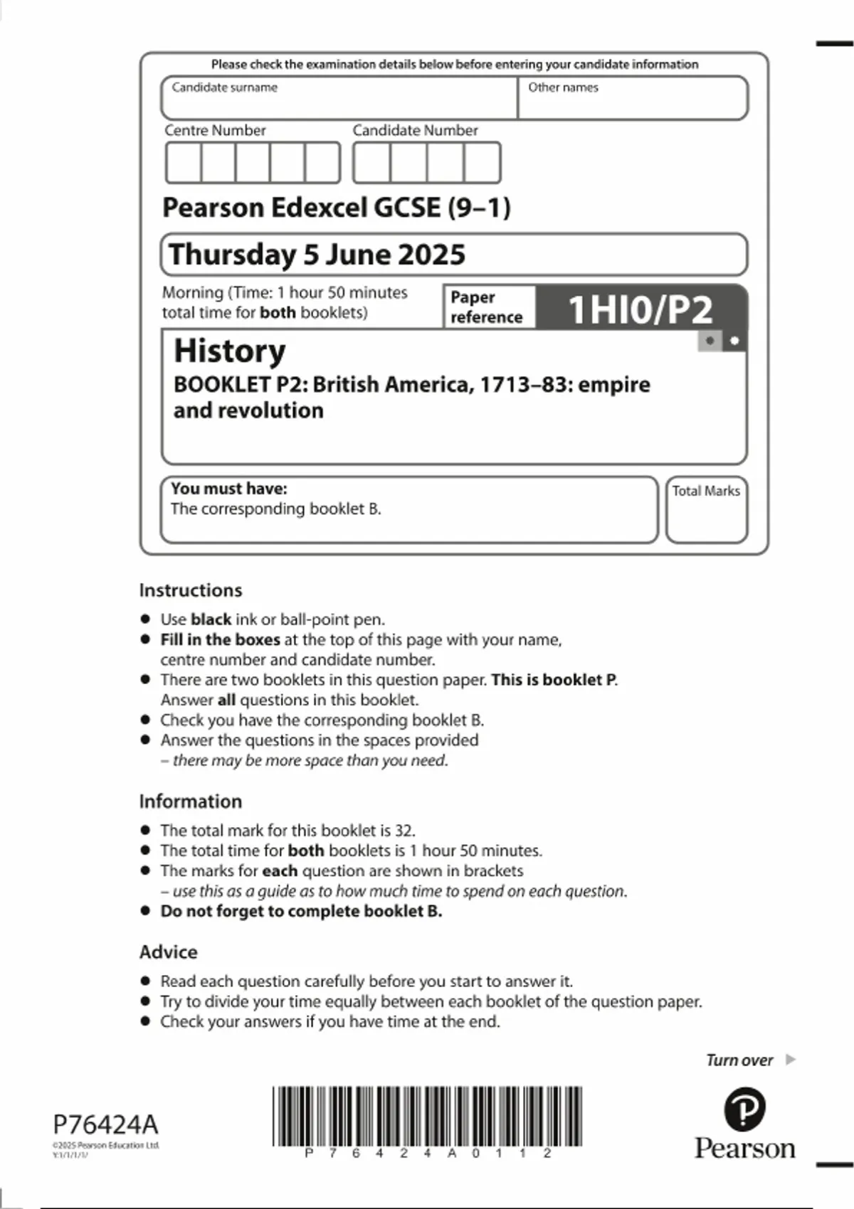 2025 PEARSON EDEXCEL GCSE HISTORY PAPER P2 QUESTION PAPER (1HI0/P2: BOOKLET P2: British America, 1713–83: empire and revolution)