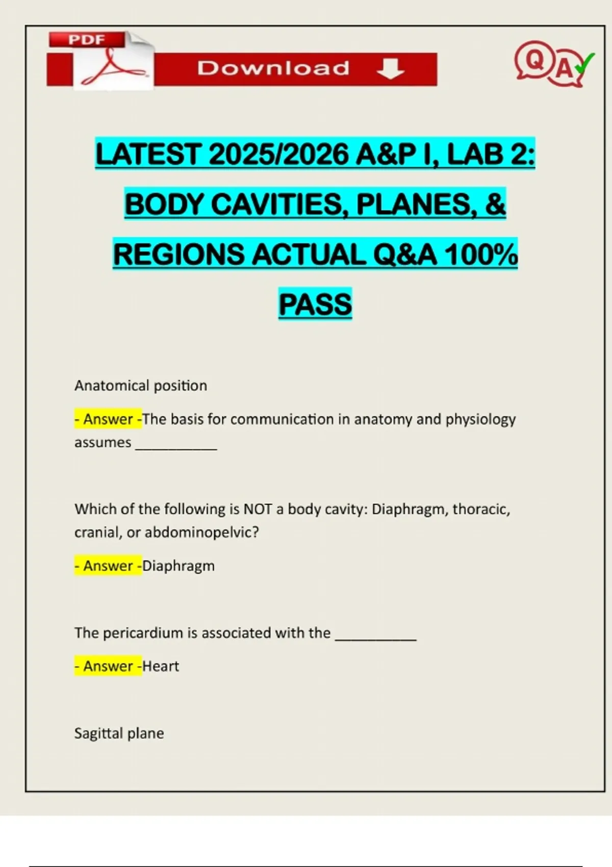 LATEST 2025/2026 A&P I, LAB 2: BODY CAVITIES, PLANES, & REGIONS ACTUAL Q&A 100% PASS
