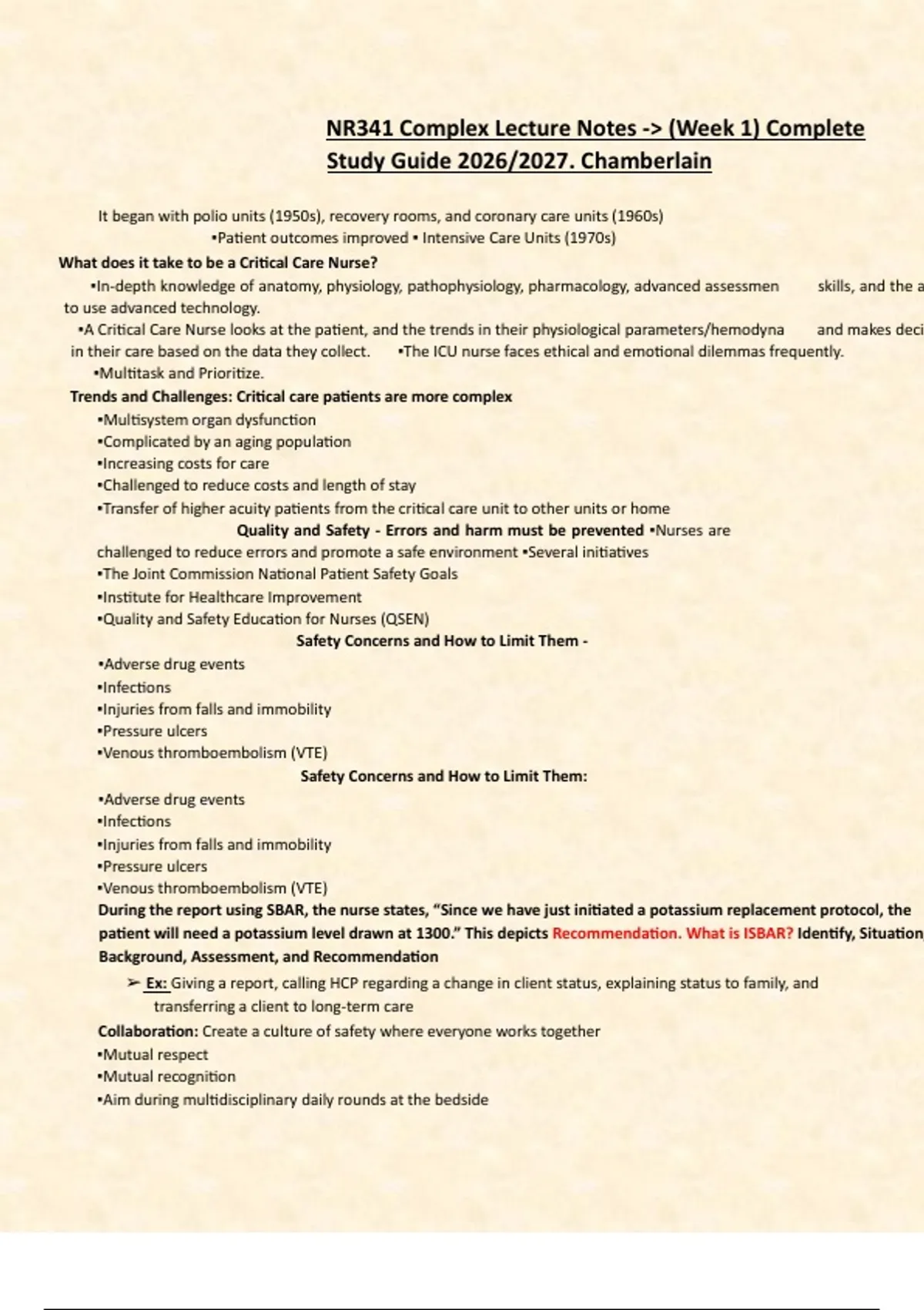 NR341 Complex Lecture Notes -> (Week 1) Complete Study Guide 2026/2027. Chamberlain It began with polio units (1950s), recovery rooms, and coronary care units (1960s) ▪Patient outcomes improved ▪ Intensive Care Units (1970s) What does it take to be a Critical Care Nurse? ▪In-depth knowledge of anatomy, physiology, pathophysiology, pharmacology, advanced assessmen skills, and the ability to use advanced technology. ▪A Critical Care Nurse looks at the patient, and the trends in their physiological parameters/hemodyna and makes decisions in their care based on the data they collect. ▪The ICU nurse faces ethical and emotional dilemmas frequently. ▪Multitask and Prioritize. Trends and Challenges: Critical care patients are more complex ▪Multisystem organ dysfunction ▪Complicated by an aging population ▪Increasing costs for care ▪Challenged to reduce costs and length of stay ▪Transfer of higher acuity patients from the critical care unit to other units or home Quality and Safety - Errors and harm must be prevented ▪Nurses are challenged to reduce errors and promote a safe environment ▪Several initiatives ▪The Joint Commission National Patient Safety Goals ▪Institute for Healthcare Improvement ▪Quality and Safety Education for Nurses (QSEN) Safety Concerns and How to Limit Them - ▪Adverse drug events ▪Infections ▪Injuries from falls and immobility ▪Pressure ulcers ▪Venous thromboembolism (VTE) Safety Concerns and How to Limit Them: ▪Adverse drug events ▪Infections ▪Injuries from falls and immobility ▪Pressure ulcers ▪Venous thromboembolism (VTE) During the report using SBAR, the nurse states, “Since we have just initiated a potassium replacement protocol, the patient will need a potassium level drawn at 1300.” This depicts Recommendation. What is ISBAR? Identify, Situation, Background, Assessment, and Recommendation Ex: Giving a report, calling HCP regarding a change in client status, explaining status to family, and transferring a client to long-term care Collaboration: Create a culture of safety where everyone works together ▪Mutual respect ▪Mutual recognition ▪Aim during multidisciplinary daily rounds at the bedside ▪Briefings are another approach