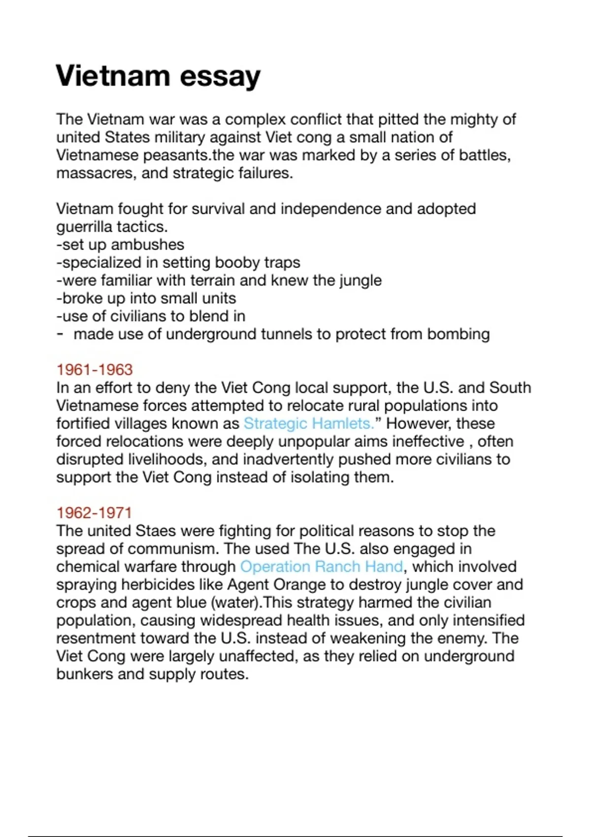 *The Vietnam War: A Pivotal Moment in Global History* The Vietnam War, spanning from 1955 to 1975, was a complex and multifaceted conflict that involved the United States, North Vietnam, South Vietnam, and other nations. This essay will examine the war's key events, players, and consequences, highlighting its far-reaching impact on global politics, international relations, and society. *Background and Escalation* The Vietnam War was a culmination of colonialism, nationalism, and Cold War rivalries. After World War II, Vietnam sought independence from French colonial rule, leading to the First Indochina War. The Geneva Accords (1954) divided Vietnam along the 17th parallel, creating North Vietnam (communist) and South Vietnam (anti-communist). The United States, fearing communist expansion, supported South Vietnam, while North Vietnam received backing from China and the Soviet Union. The Gulf of Tonkin incident (1964) led to increased US involvement, with ground troops deployed in 1965. *Key Events and Turning Points* 1. *Tet Offensive (1968)*: North Vietnamese and Viet Cong forces launched a surprise attack, shifting US public opinion against the war. 2. *My Lai Massacre (1968)*: US soldiers killed hundreds of unarmed Vietnamese civilians, further eroding support. 3. *Paris Peace Talks ()*: Negotiations failed to end the war, leading to continued fighting. 4. *Fall of Saigon (1975)*: North Vietnamese forces captured the South's capital, reunifying Vietnam under communist rule. *Global Impact* The Vietnam War had significant consequences: 1. *US foreign policy*: The war led to a more cautious approach, with increased congressional oversight. 2. *International relations*: The war strained US relations with allies and fueled anti-American sentiment. 3. *Global protests*: Widespread demonstrations against the war highlighted growing anti-war sentiment. 4. *Refugee crisis*: Many Vietnamese fled, creating a significant refugee population. *Legacy and Lessons* The Vietnam War offers important lessons: 1. *Interventionism*: The war highlighted the complexities of military intervention. 2. *Public opinion*: The war showed the importance of public support for military action. 3. *Media influence*: The war demonstrated the power of media in shaping public opinion. 4. *International cooperation*: The war underscored the need for cooperation and diplomacy. *References* 1. *The Pentagon Papers (1971)*: Classified documents revealing government deception about the war. 2. *"The Vietnam War" by Stanley Karnow (1983)*: Comprehensive history of the war. 3. *"Apocalypse Now" (1979)*: Film exploring the war's psychological and cultural impact. The Vietnam War's impact extends beyond the battlefield, influencing global politics, international relations, and society. Its legacy serves as a reminder of the complexities and consequences of conflict.