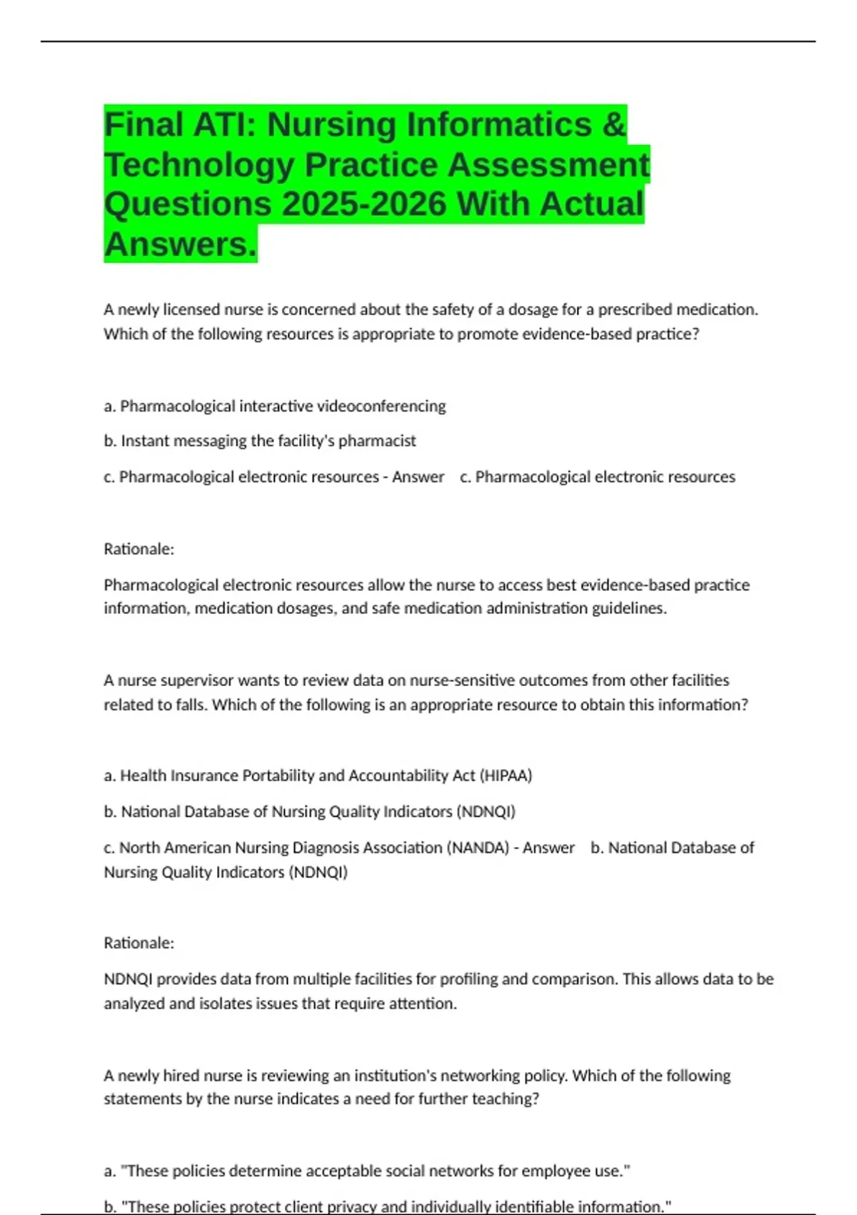 A newly licensed nurse is concerned about the safety of a dosage for a prescribed medication. Which of the following resources is appropriate to promote evidence-based practice? a. Pharmacological interactive videoconferencing b. Instant messaging the facility's pharmacist c. Pharmacological electronic resources - Answer c. Pharmacological electronic resources Rationale: Pharmacological electronic resources allow the nurse to access best evidence-based practice information, medication dosages, and safe medication administration guidelines. A nurse supervisor wants to review data on nurse-sensitive outcomes from other facilities related to falls. Which of the following is an appropriate resource to obtain this information? a. Health Insurance Portability and Accountability Act (HIPAA) b. National Database of Nursing Quality Indicators (NDNQI) c. North American Nursing Diagnosis Association (NANDA) - Answer b. National Database of Nursing Quality Indicators (NDNQI) Rationale: NDNQI provides data from multiple facilities for profiling and comparison. This allows data to be analyzed and isolates issues that require attention. A newly hired nurse is reviewing an institution's networking policy. Which of the following statements by the nurse indicates a need for further teaching? a. "These policies determine acceptable social networks for employee use." b. "These policies protect client privacy and individually identifiable information." c. "These policies prevent the introduction of viruses into the network." - Answer a. "These policies determine acceptable social networks for employee use."