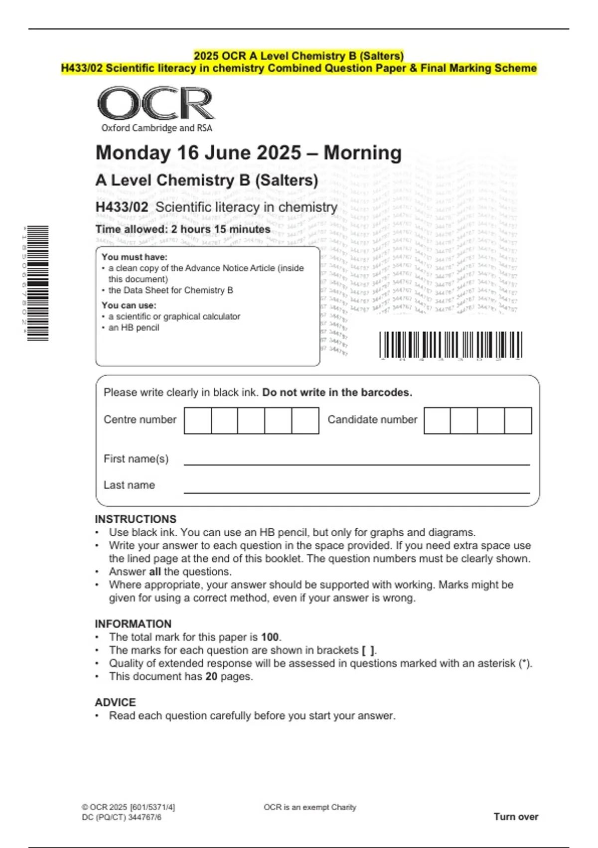 H433/02 Scientific literacy in chemistry Combined Question Paper & Final Marking Scheme