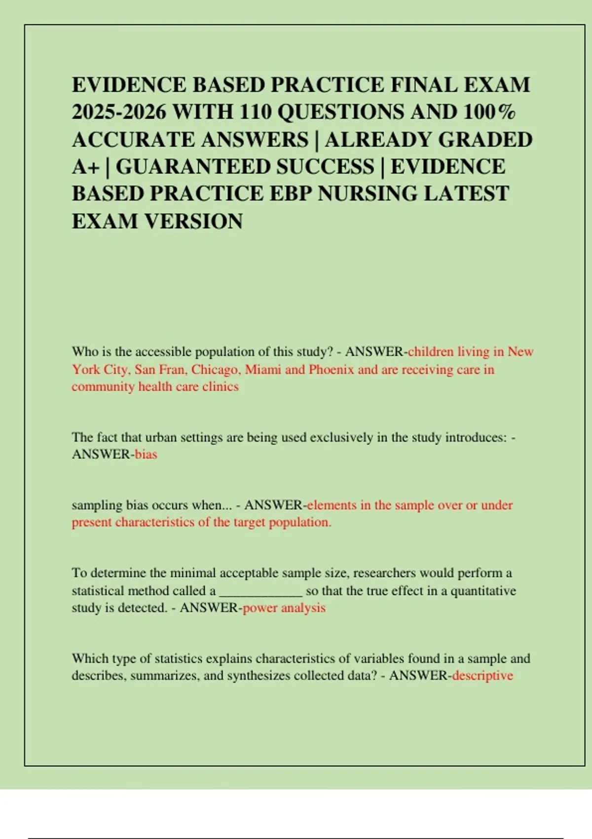 EVIDENCE BASED PRACTICE FINAL EXAM WITH 110 QUESTIONS AND 100% ACCURATE ANSWERS | ALREADY GRADED A+ | GUARANTEED SUCCESS | EVIDENCE BASED PRACTICE EBP NURSING LATEST EXAM VERSION Who is the accessible population of this study? - ANSWER-children living in New York City, San Fran, Chicago, Miami and Phoenix and are receiving care in community health care clinics The fact that urban settings are being used exclusively in the study introduces: - ANSWER-bias sampling bias occurs when... - ANSWER-elements in the sample over or under present characteristics of the target population. To determine the minimal acceptable sample size, researchers would perform a statistical method called a ____________ so that the true effect in a quantitative study is detected. - ANSWER-power analysis Which type of statistics explains characteristics of variables found in a sample and describes, summarizes, and synthesizes collected data? - ANSWER-descriptive