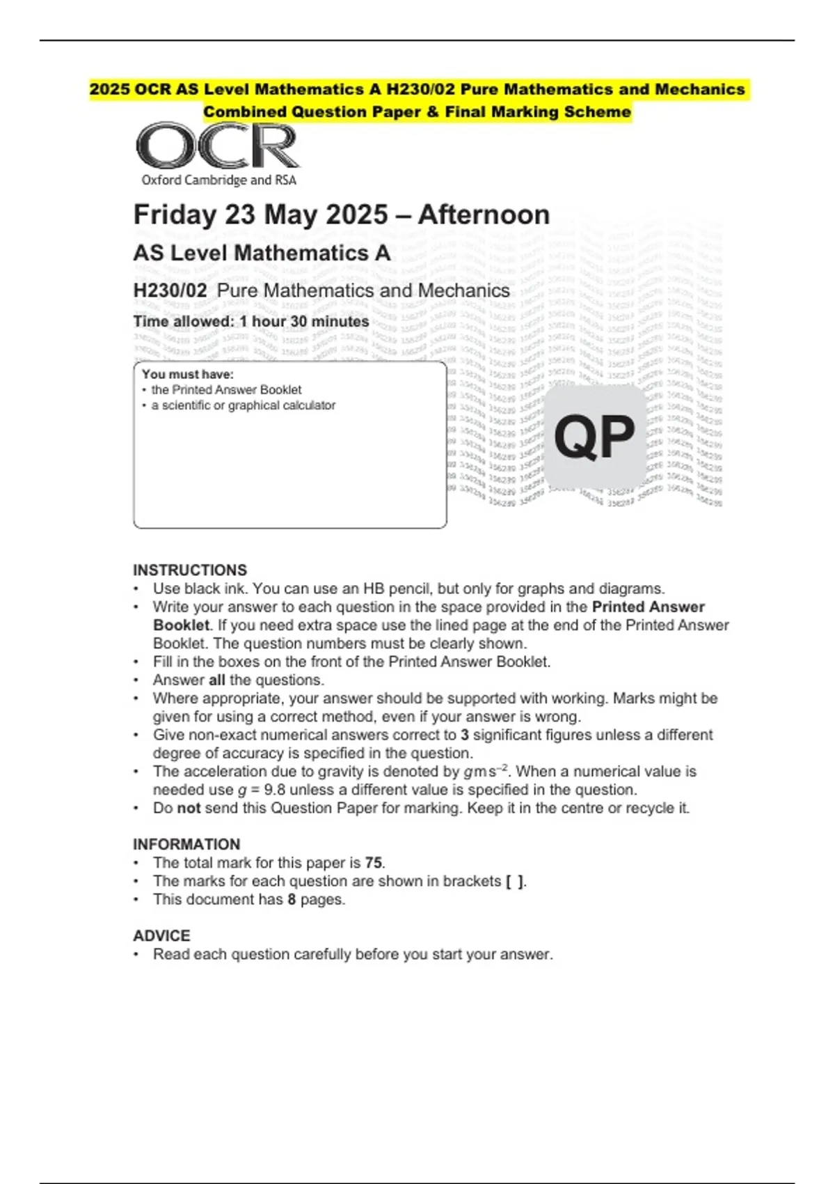 2025 OCR AS Level Mathematics A H230/02 Pure Mathematics and Mechanics Combined Question Paper & Final Marking Scheme