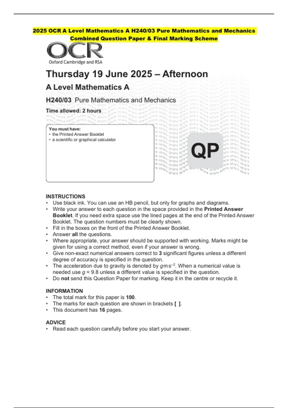 H240/03 Pure Mathematics and Mechanics