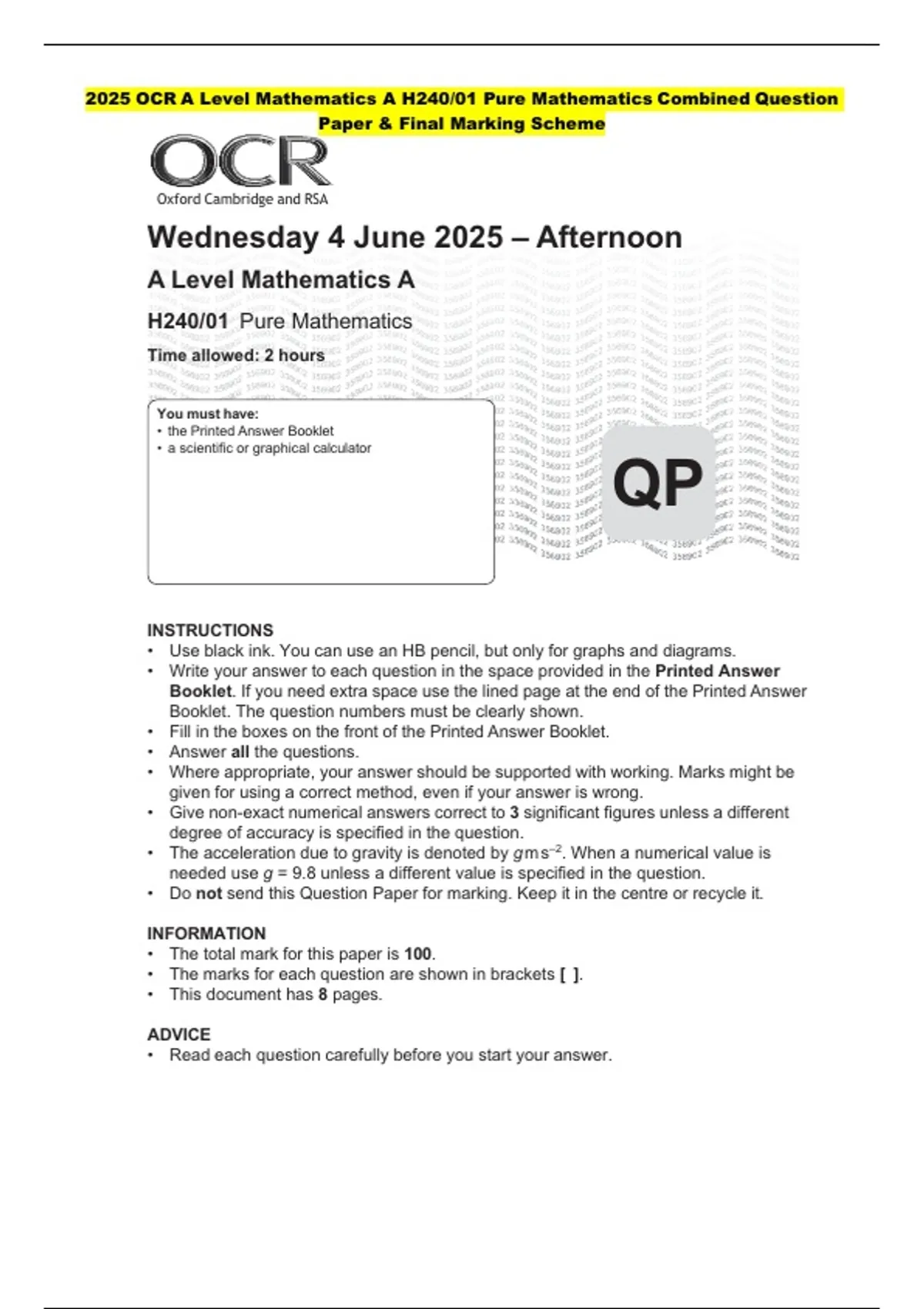 2025 OCR A Level Mathematics A H240/01 Pure Mathematics Combined Question Paper & Final Marking Scheme
