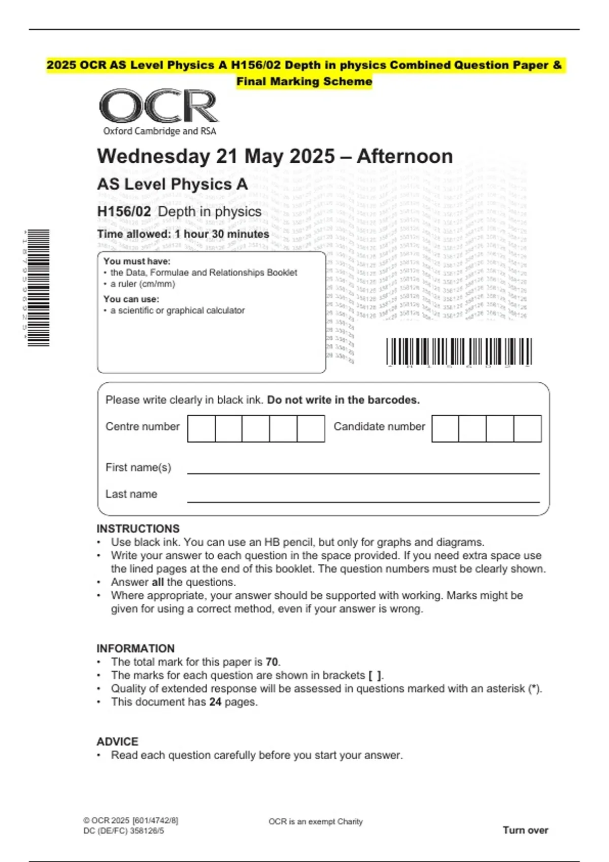 • the Data, Formulae and Relationships Booklet