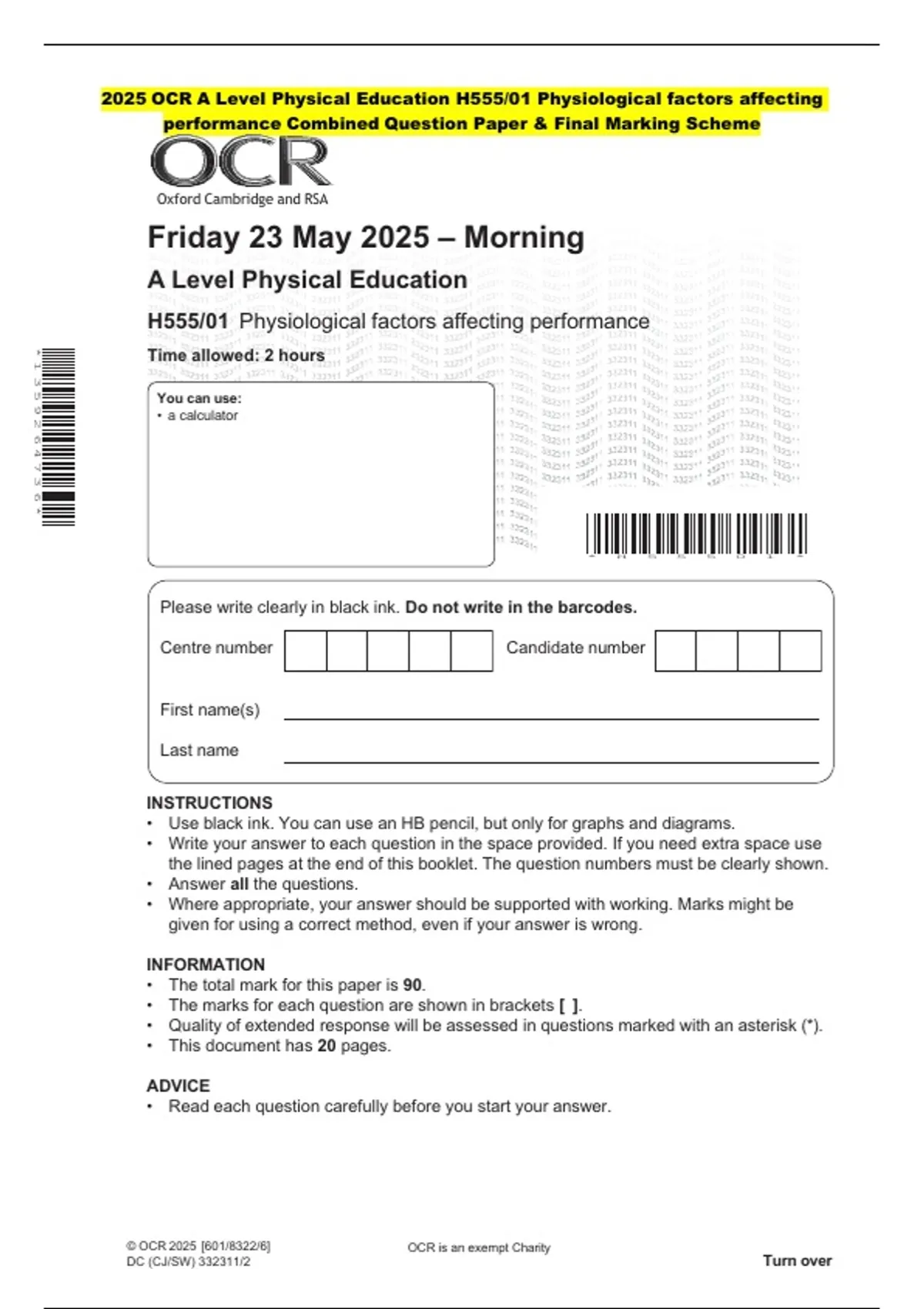 2025 OCR A Level Physical Education H555/01 Physiological factors affecting performance Combined Question Paper & Final Marking Scheme