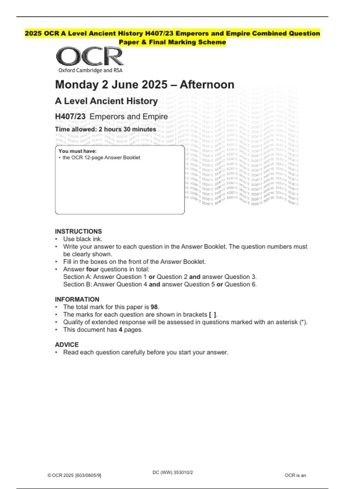 2025 OCR A Level Ancient History H407/23 Emperors and Empire Combined Question Paper & Final Marking Scheme