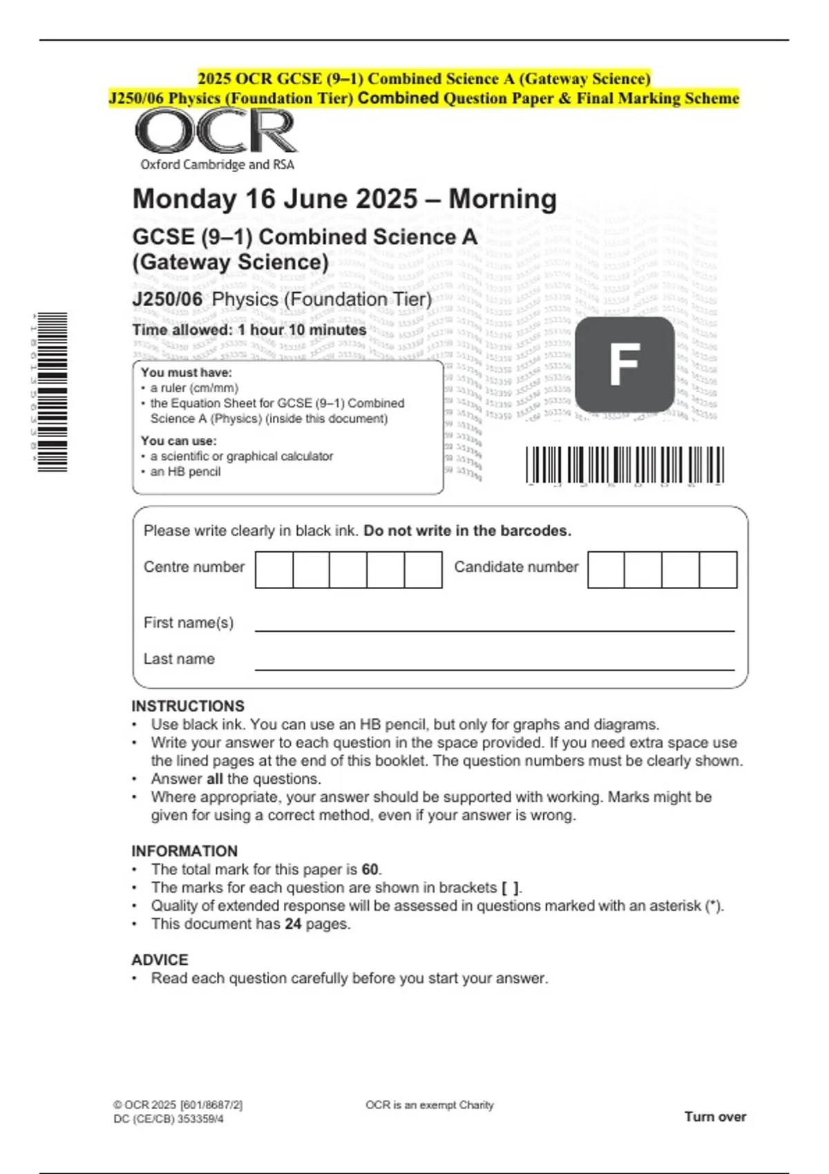 2025 OCR GCSE (9–1) Combined Science A (Gateway Science) J250/06 Physics (Foundation Tier) Combined Question Paper & Final Marking Scheme