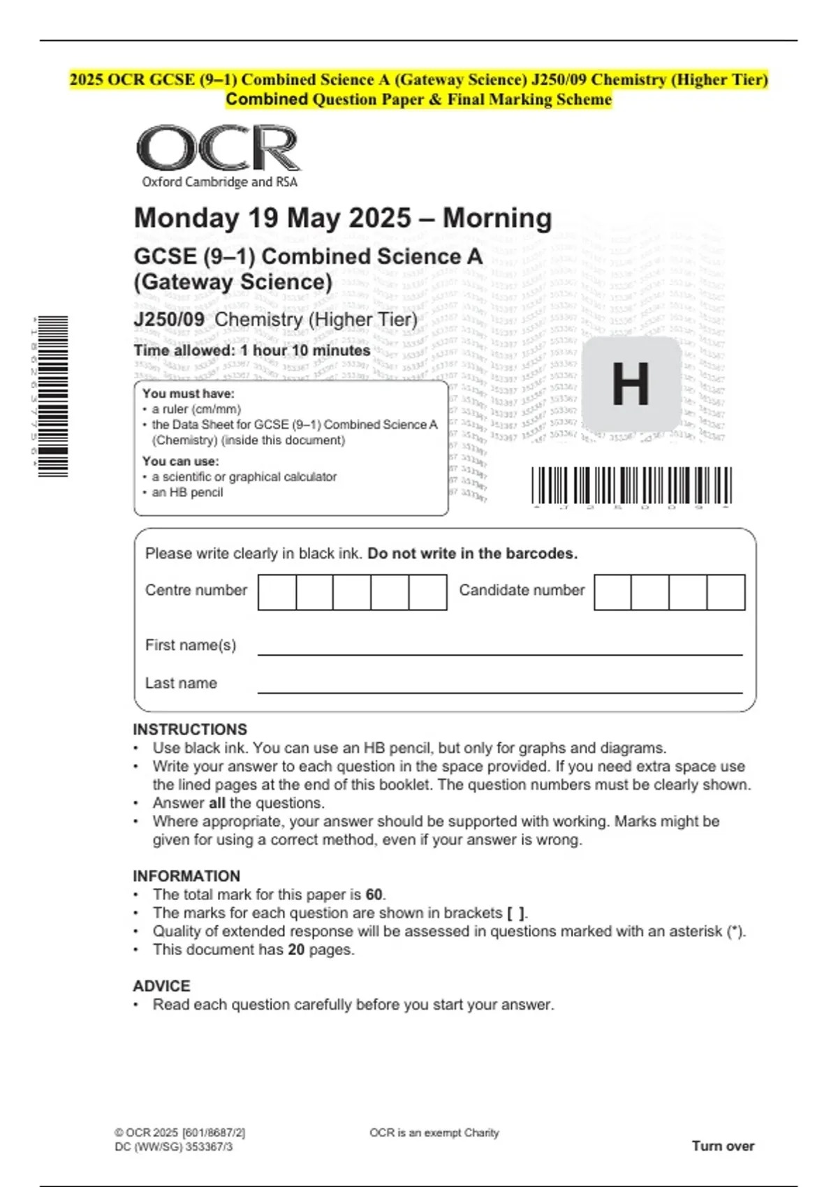 2025 OCR GCSE (9–1) Combined Science A (Gateway Science) J250/09 Chemistry (Higher Tier) Combined Question Paper & Final Marking Scheme