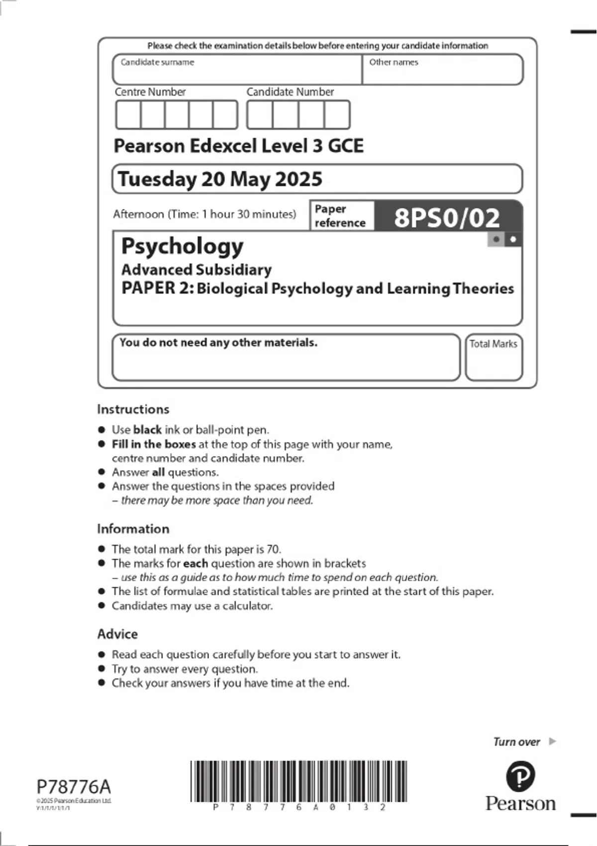2025 GCE PEARSON EDEXCEL LEVEL3 PSYCHOLOGY ADVANCED SUBSIDIARY PAPER 2: BIOLOGICAL PSYCHOLOGY AND LEARNING THEORIES COMBINED QUESTION PAPER AND MARKING SCHEME