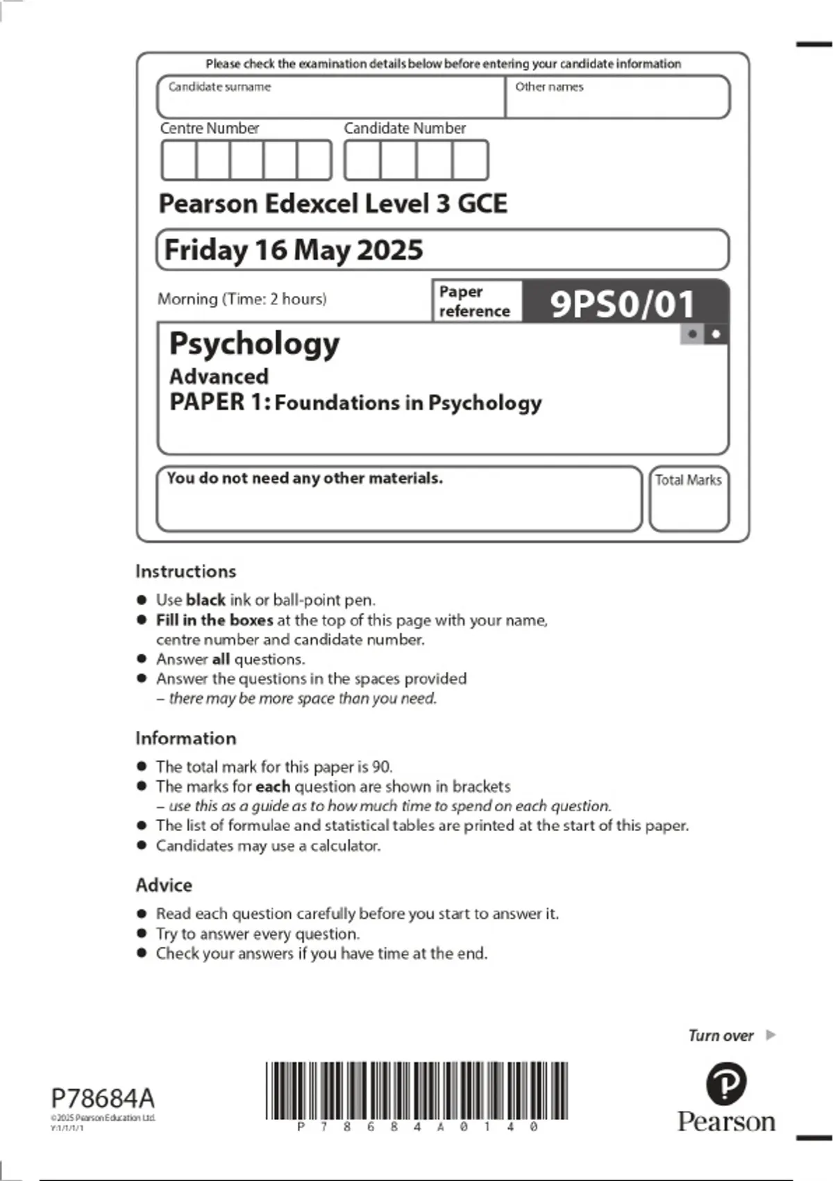 2025 GCE PEARSON EDEXCEL LEVEL3 PSYCHOLOGY ADVANCED PAPER 1: FOUNDATIONS OF PSYCHOLOGY COMBINED QUESTION PAPER AND MARKING SCHEME
