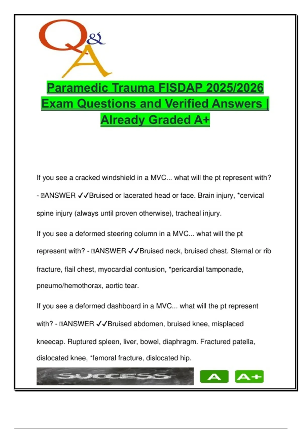 This document includes over 180 high-yield trauma-focused questions and verified answers designed for Paramedic students preparing for the FISDAP Trauma Exam 2025/2026. It follows a clear question-and-answer format with accurate explanations and clinical context for each answer. Topics are drawn directly from real-world trauma scenarios and align with the National Registry of EMT standards and FISDAP testing blueprint. Key trauma categories covered include: Mechanism of Injury in MVCs (cracked windshield, dashboard deformation, up-and-over/down-and-under pathways) Blast injuries, blunt vs. penetrating trauma, gunshot wounds, and stab wounds Head trauma and brain injuries (GCS, coup-contrecoup, ICP management, herniation signs) Thoracic injuries (flail chest, pneumothorax, pericardial tamponade, commotio cordis) Abdominal trauma, including spleen/liver injury, retroperitoneal organ damage, Kehr's sign Burns (superficial to full-thickness, rule of nines, inhalation burns, electrical/chemical burns, HF acid exposure) Fractures and splinting techniques, femur and spinal injuries Shock management (hypovolemic, compensated vs. decompensated, crush syndrome, compartment syndrome) Facial, eye, ear, and neck trauma, including Le Fort fractures, epistaxis, orbital injuries Environmental emergencies (hypothermia, heatstroke, frostbite) Neurological trauma (Babinski reflex, Cushing's triad, decorticate vs. decerebrate posturing) All answers are pre-graded A+ and offer paramedic-level insight to help reinforce critical thinking, trauma assessment skills, and priority-based patient care decision-making. This resource is ideal for: Paramedic students in advanced trauma or clinical courses EMT-P candidates preparing for the National Registry or FISDAP trauma exams Students in Accredited EMS programs such as Community Colleges, Fire Academy EMT programs, or Paramedic schools across the US EMS educators looking for ready-to-use trauma review materials Keywords: FISDAP trauma exam, paramedic trauma questions, MVC injury patterns, gunshot wounds, shock management, ICP, burns EMS, head injury, Le Fort fractures, blast injuries, airway trauma, hypovolemic shock, femur fracture splinting, EMS board prep, paramedic 2025