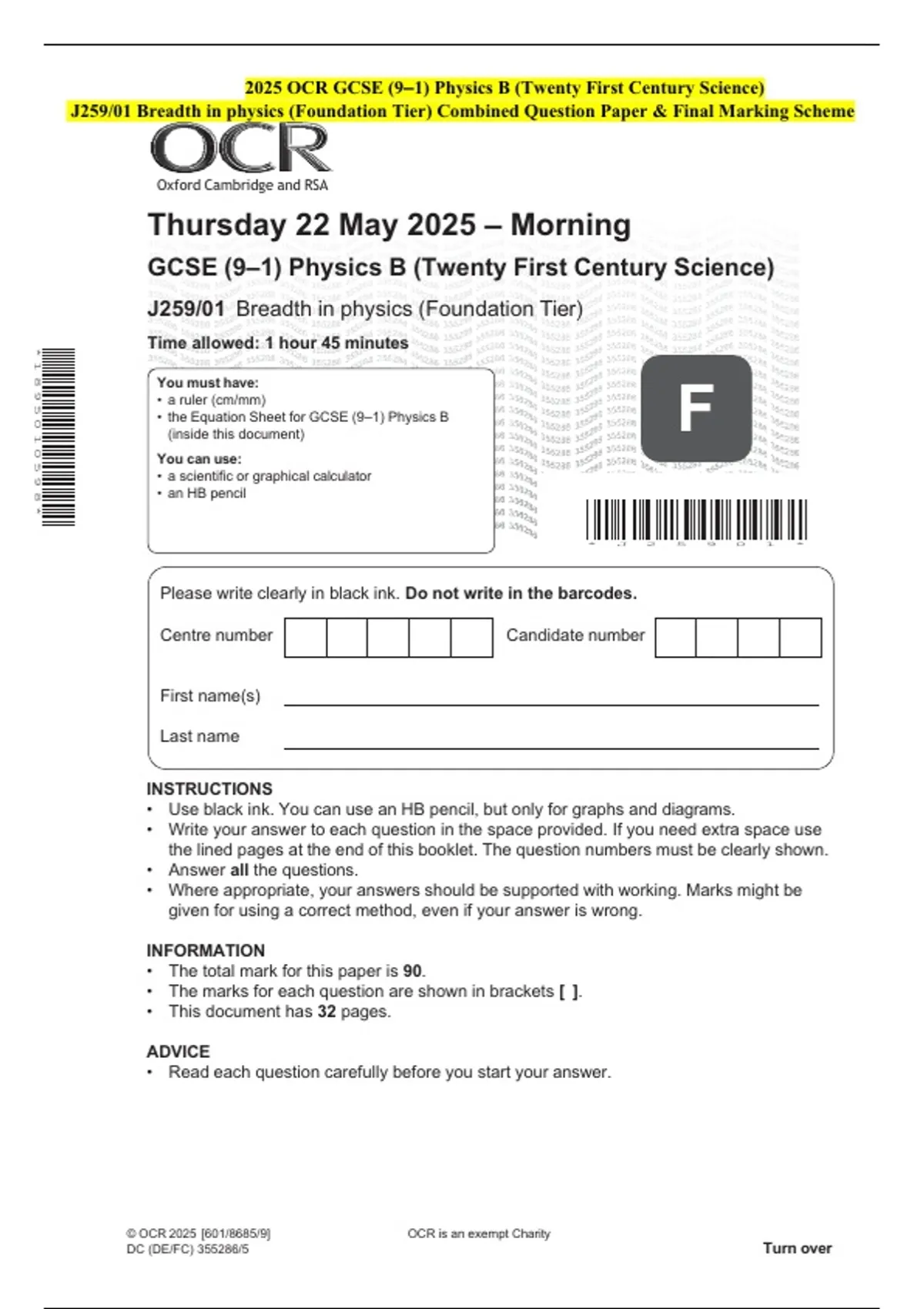 2025 OCR GCSE (9–1) Physics B (Twenty First Century Science) J259/01 Breadth in physics (Foundation Tier) Combined Question Paper & Final Marking Scheme