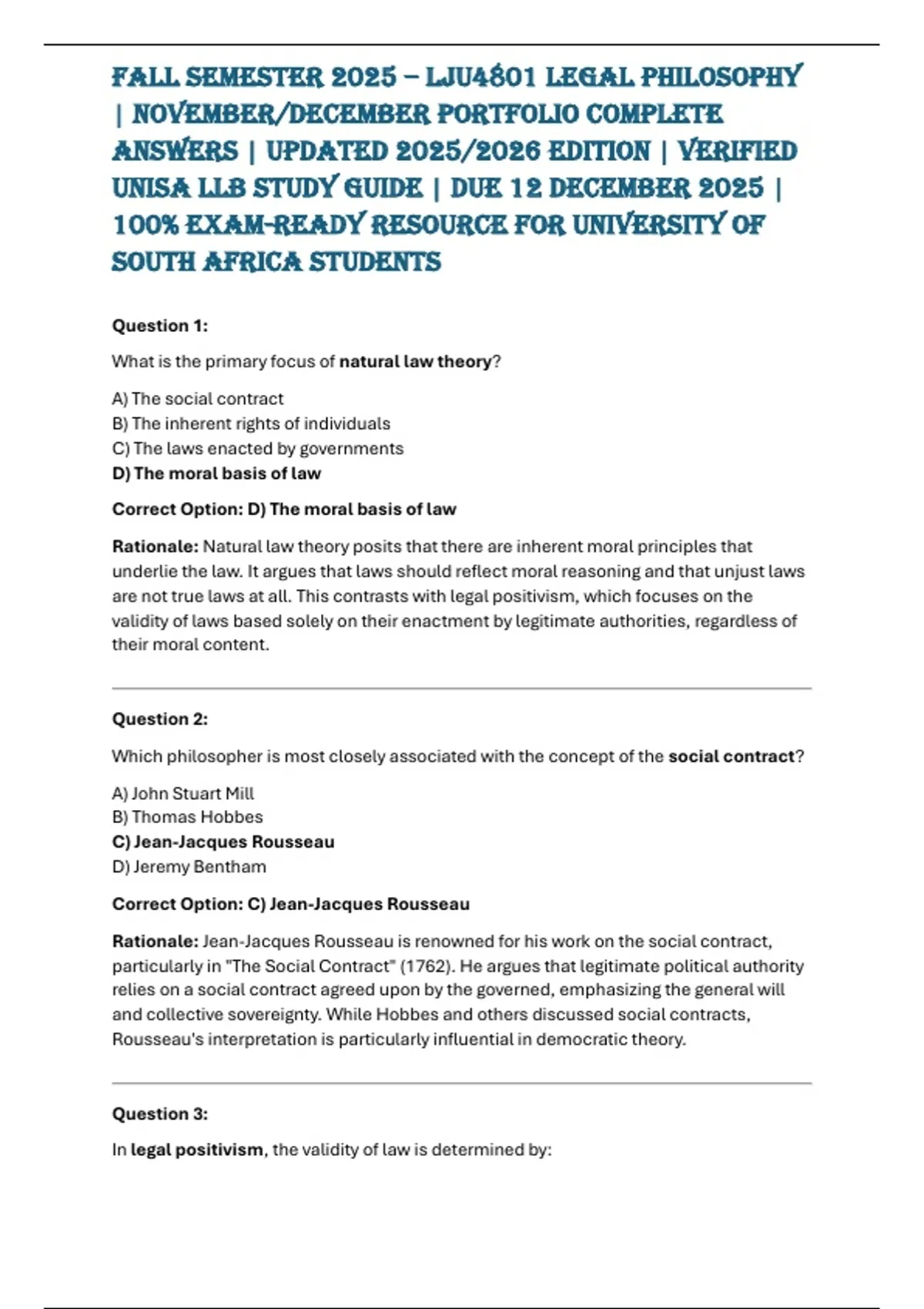 Fall Semester 2025 – LJU4801 Legal Philosophy | November/December Portfolio COMPLETE ANSWERS | Updated 2025/2026 Edition | Verified UNISA LLB Study Guide | Due 12 December 2025 | 100% Exam-Ready Resource for University of South Africa Students
