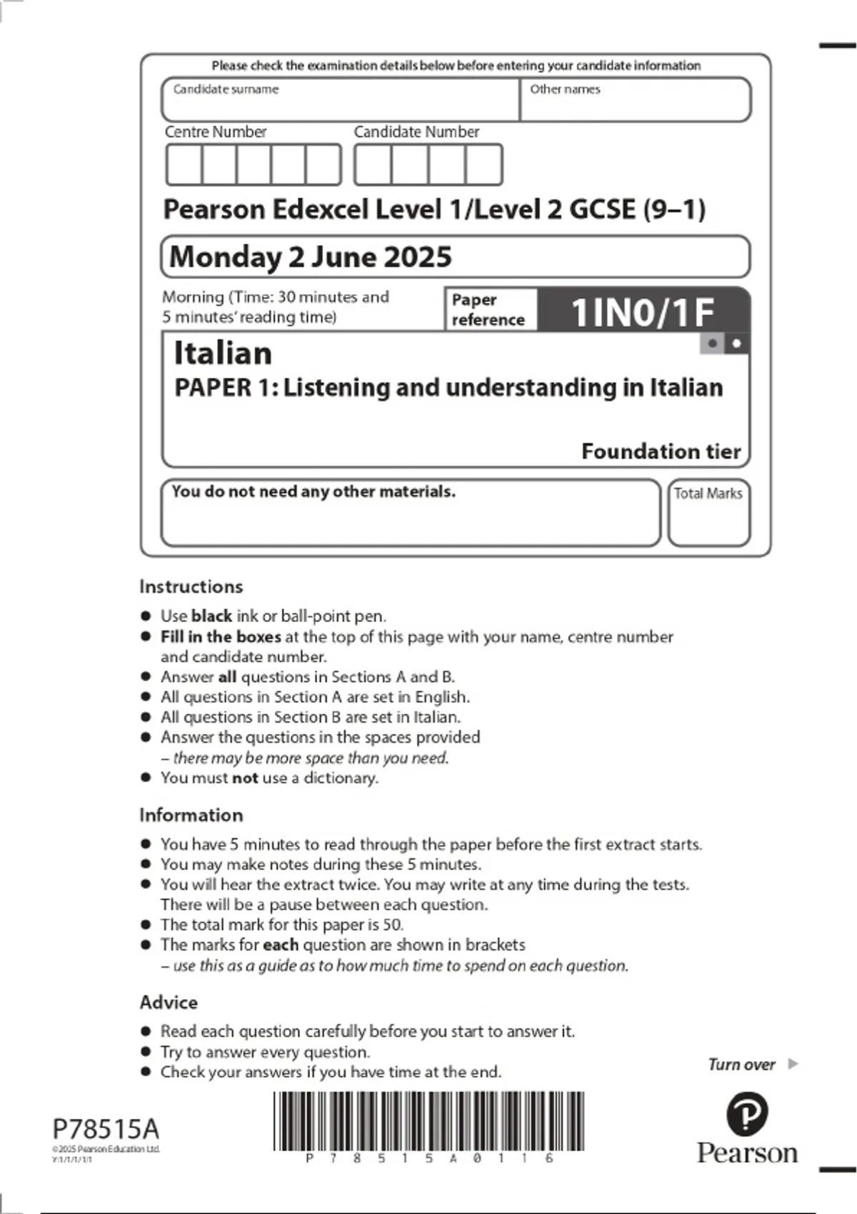 2025 Pearson Edexcel Level 1/Level 2 GCSE (9–1) Italian PAPER 1: Listening and understanding in Italian Foundation tier Combined Question Paper & Marking Scheme