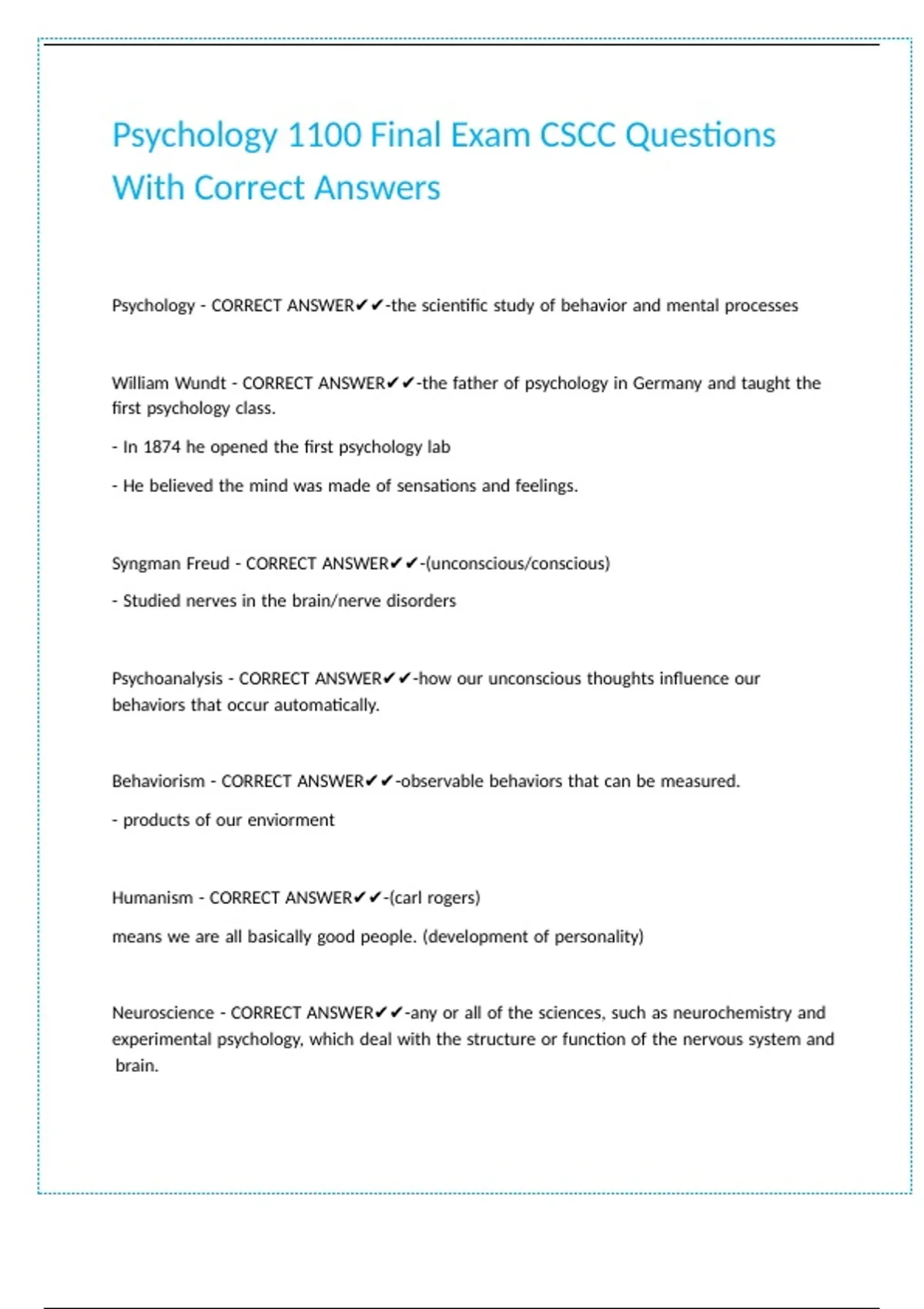 Psychology 1100 Final Exam CSCC Questions With Correct Answers.