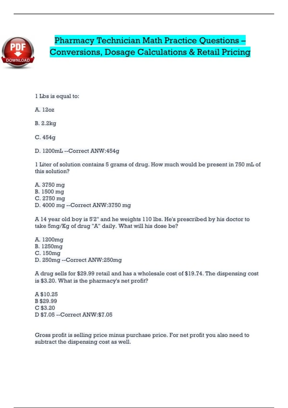 Conversions, Dosage Calculations & Retail Pricing