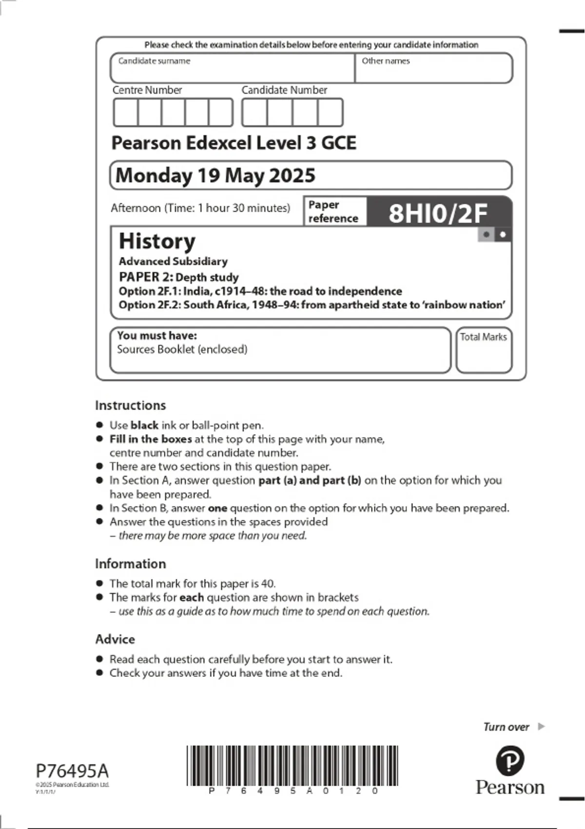 2025 Pearson Edexcel Level 3 GCE History Advanced Subsidiary PAPER 2: Depth study Option 2F.1: India, c1914–48: the road to independence Option 2F.2: South Africa, 1948–94: from apartheid state to ‘rainbow nation’ Combined Question Paper & Final Marking