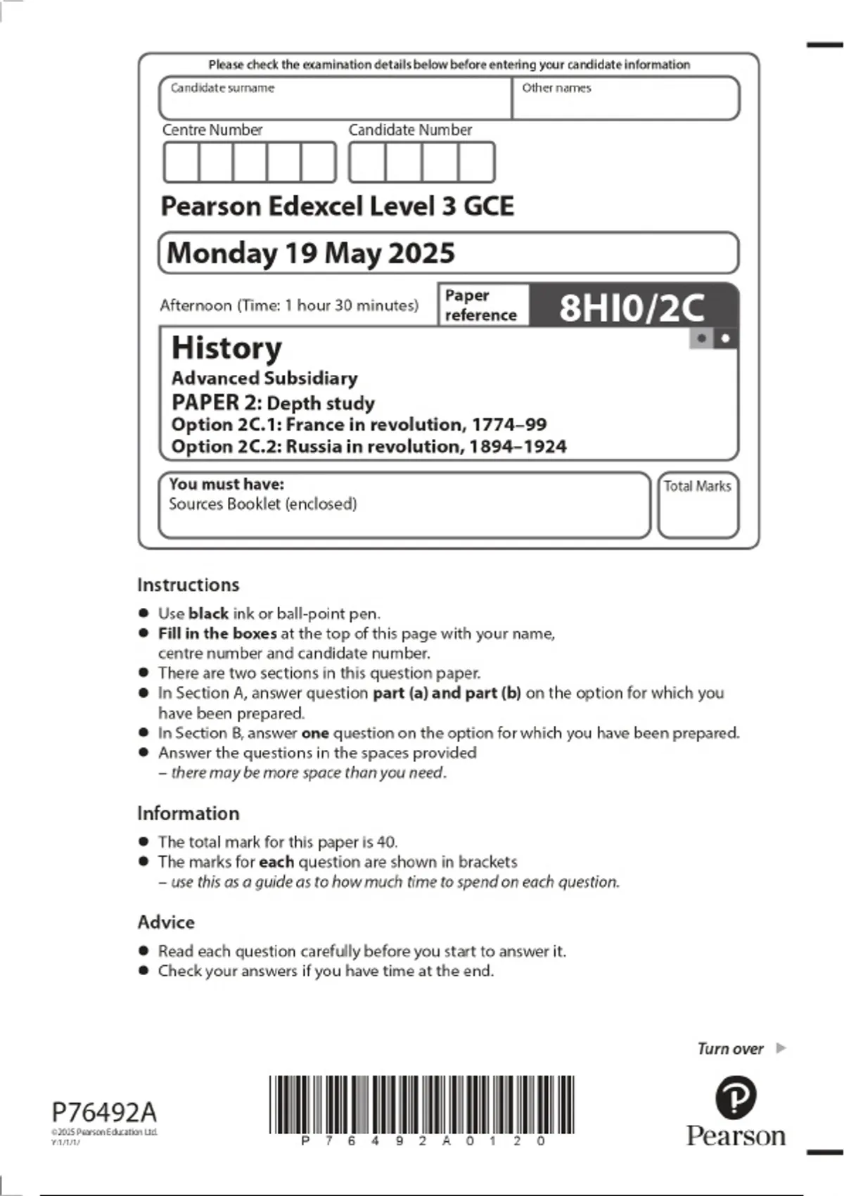 2025 Pearson Edexcel Level 3 GCE History Advanced Subsidiary PAPER 2: Depth study Option 2C.1: France in revolution, 1774–99 Option 2C.2: Russia in revolution, 1894–1924 Combined Question Paper & Final Marking Scheme