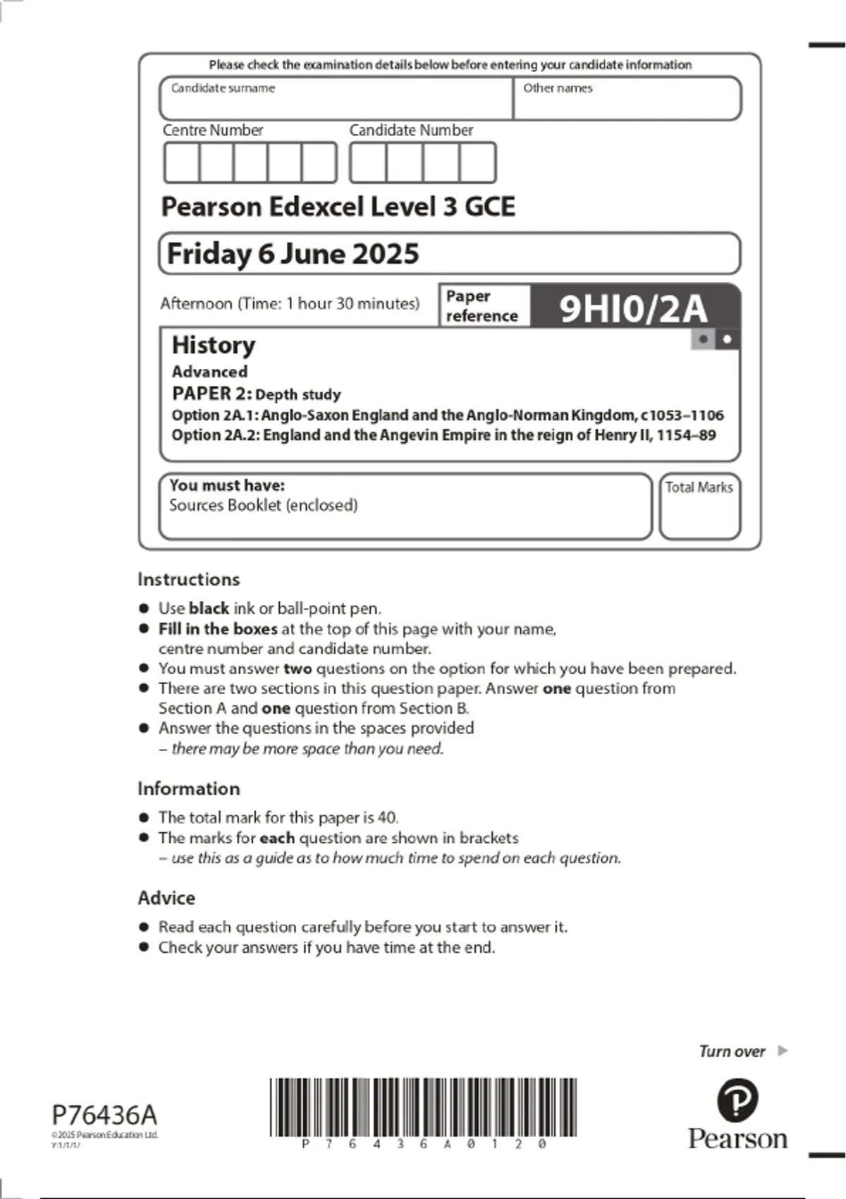 2025 Pearson Edexcel Level 3 GCE History Advanced PAPER 2: Depth study Option 2A.1: Anglo-Saxon England and the Anglo-Norman Kingdom, c1053–1106 Option 2A.2: England and the Angevin Empire in the reign of Henry II, 1154–89 Combined Question Paper & Fin