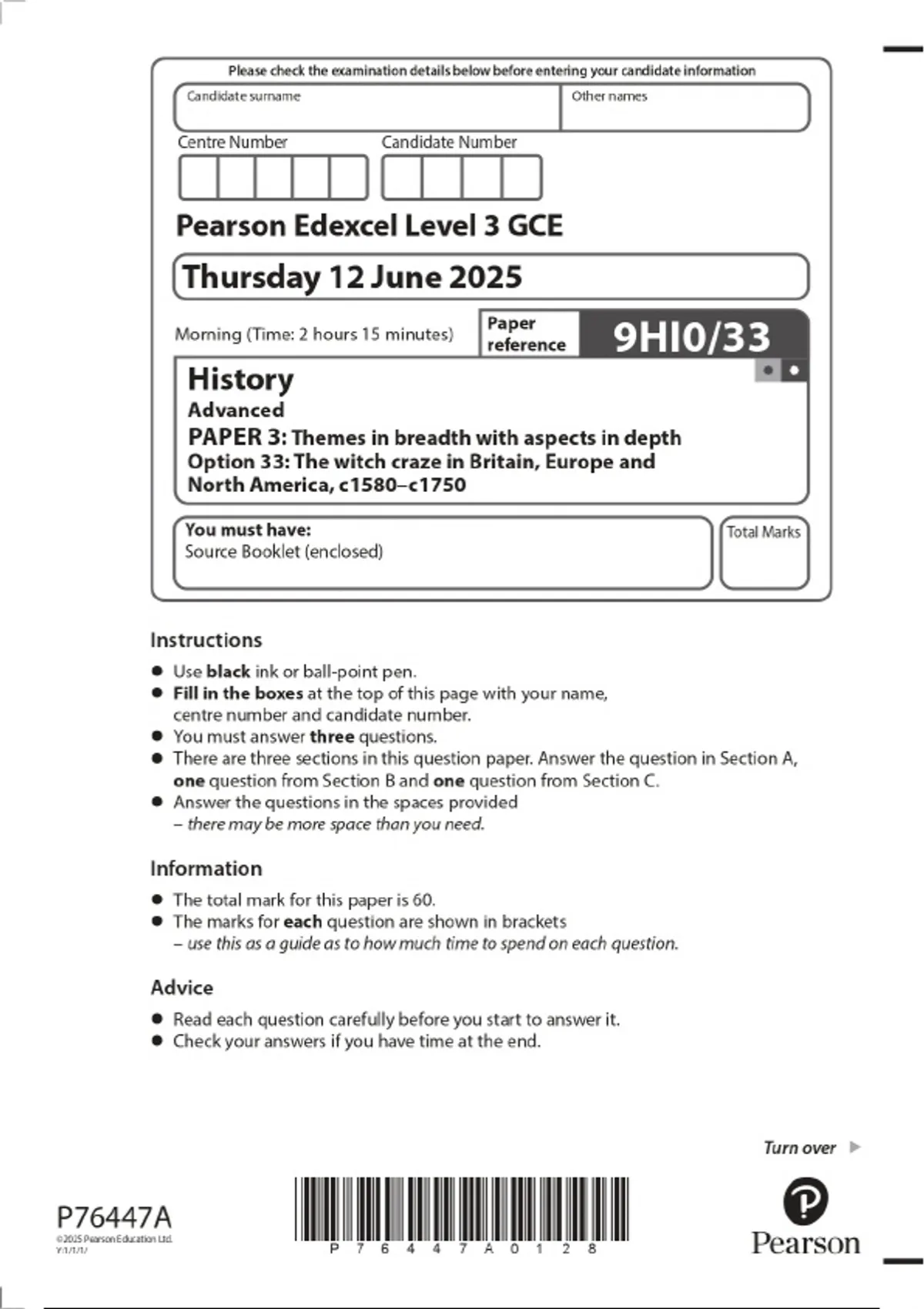 2025 Pearson Edexcel Level 3 GCE History Advanced PAPER 3: Themes in breadth with aspects in depth Option 33: The witch craze in Britain, Europe and North America, c1580–c1750 Combined Question Paper & Final Marking Scheme