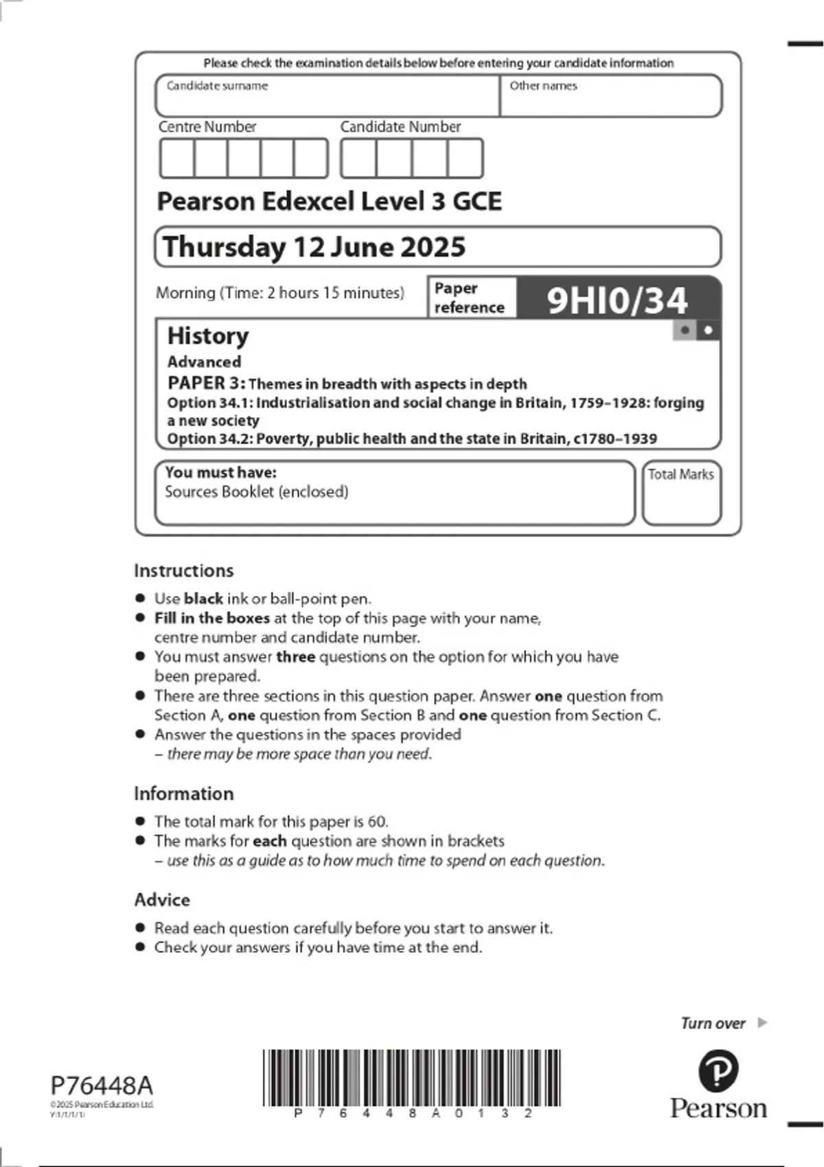 2025 Pearson Edexcel Level 3 GCE History Advanced PAPER 3: Themes in breadth with aspects in depth Option 34.1: Industrialization and social change in Britain, 1759–1928: forging a new society Option 34.2: Poverty, public health and the state in Britai